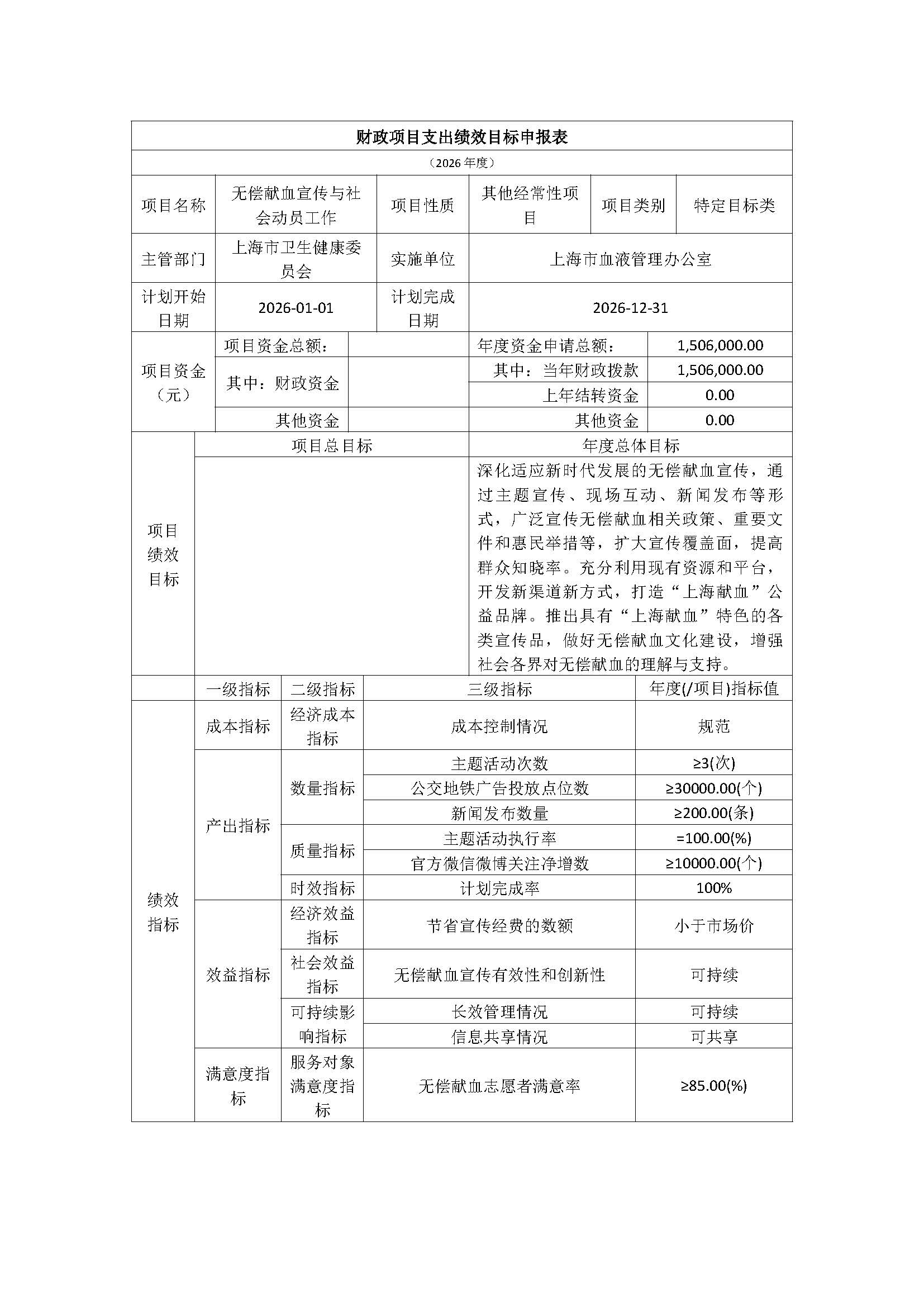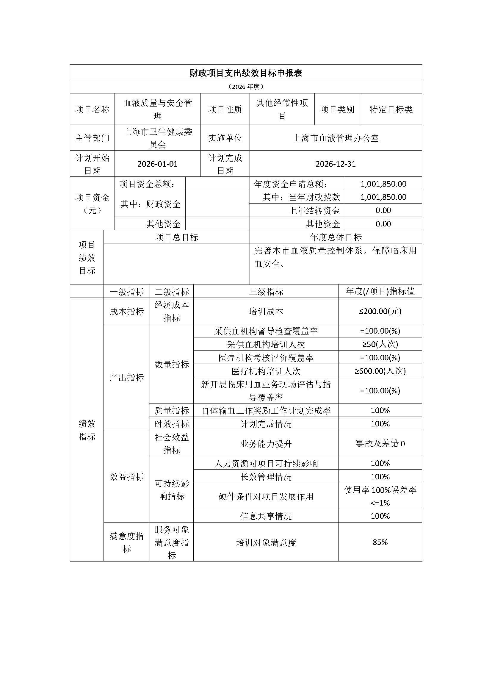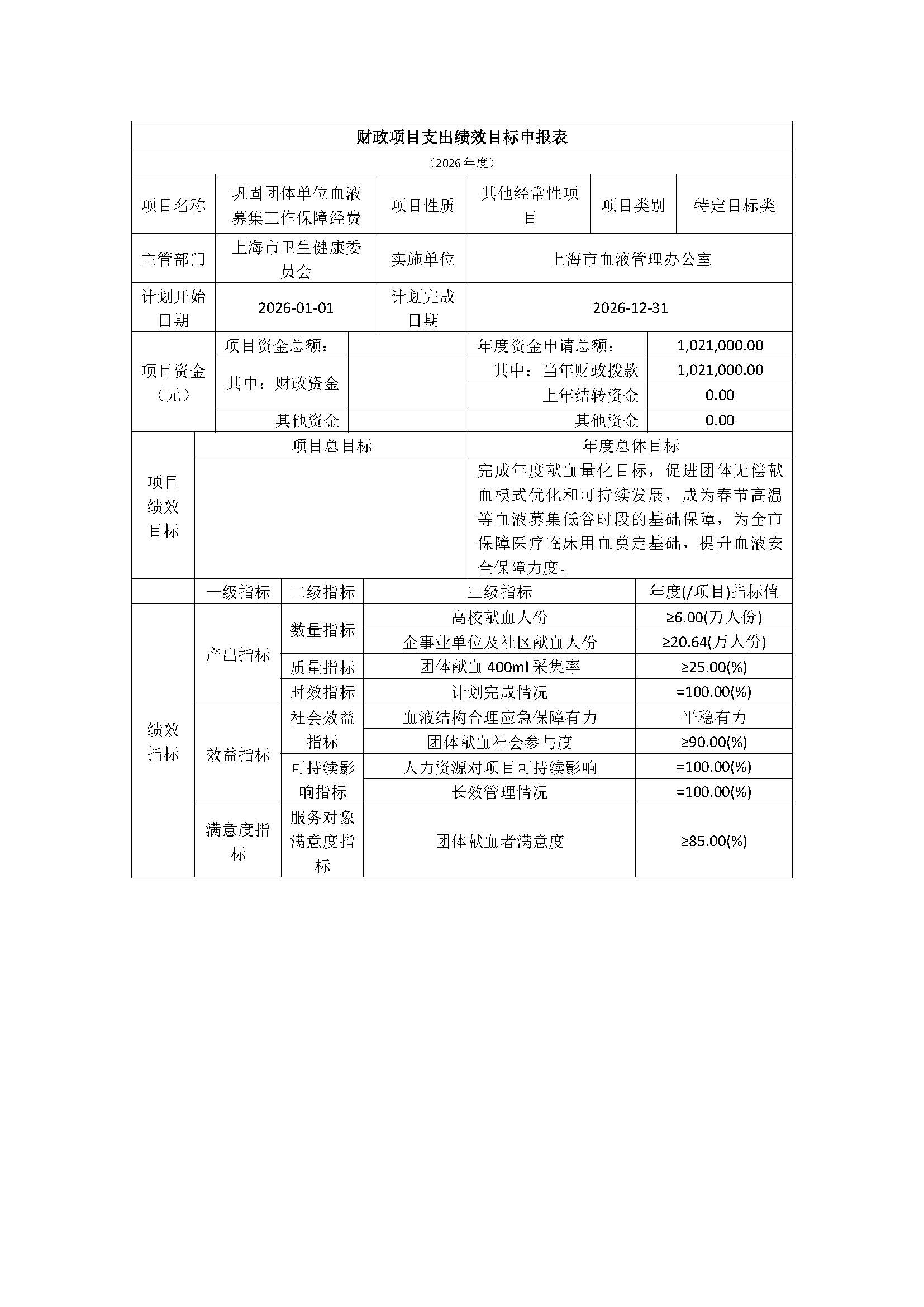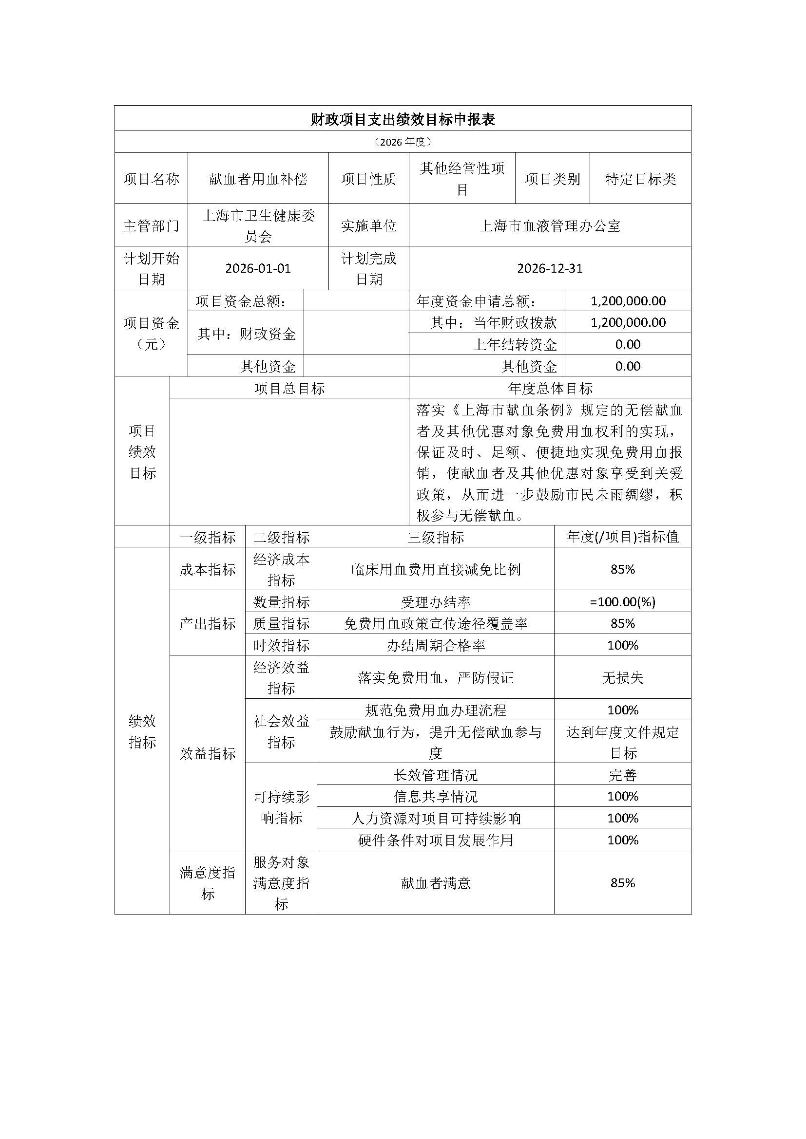 上海市血液管理办公室2026年度项目绩效目标汇总表