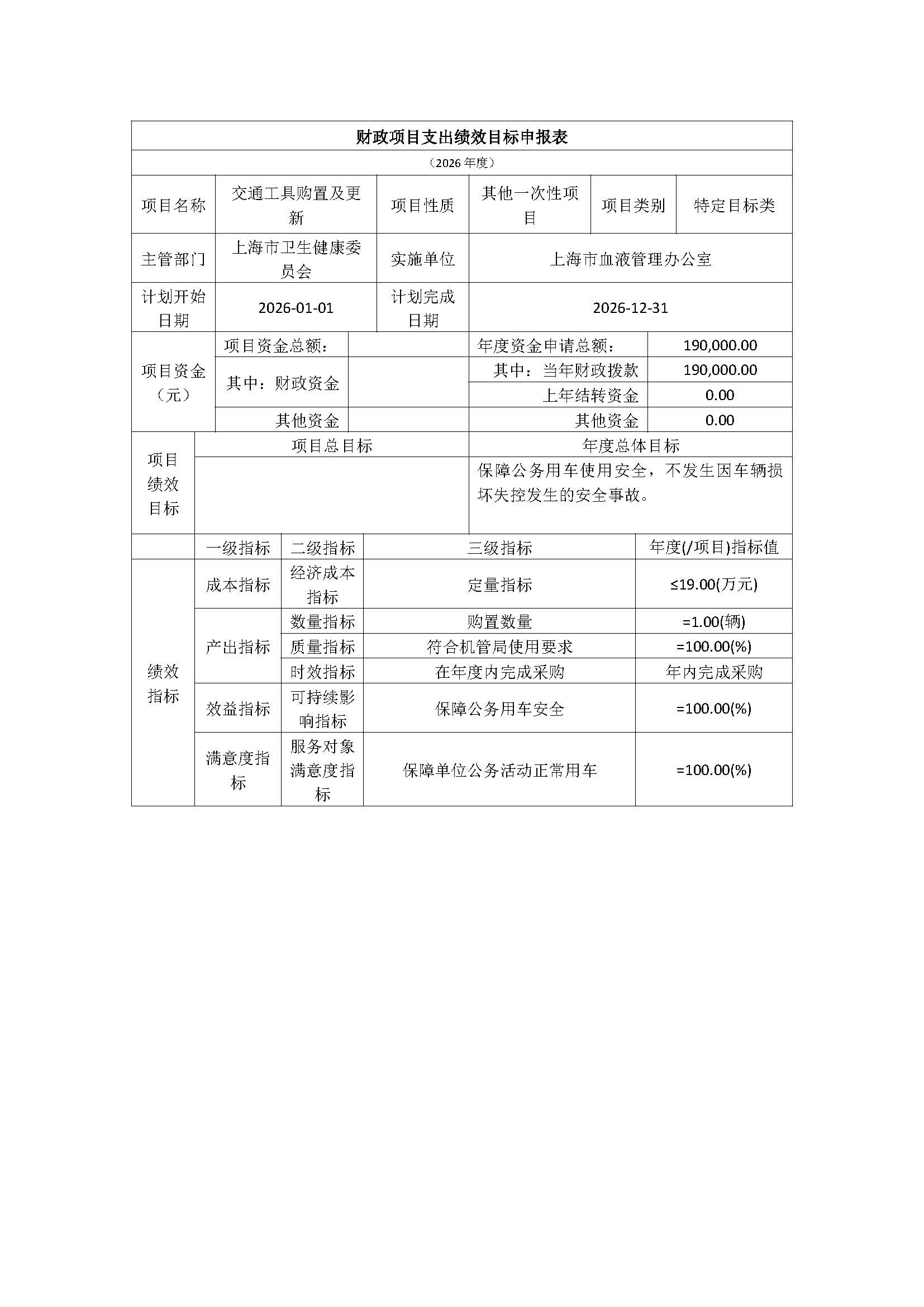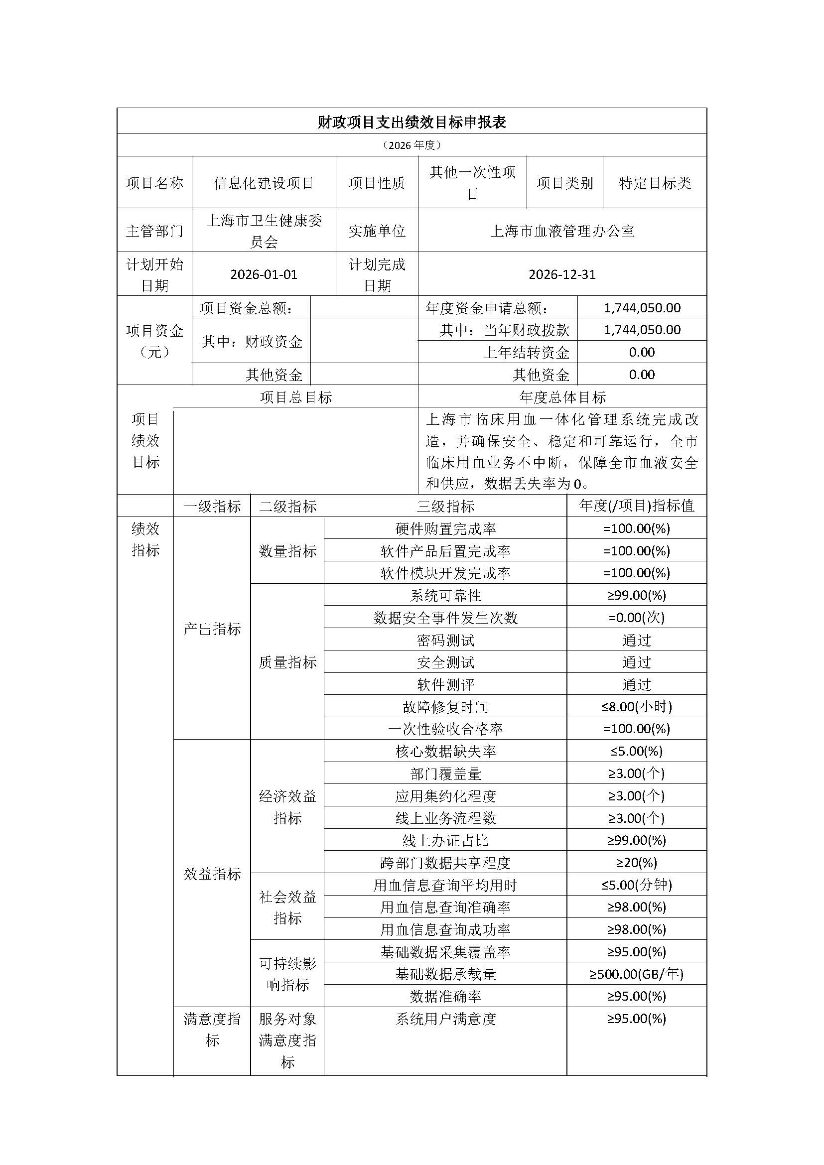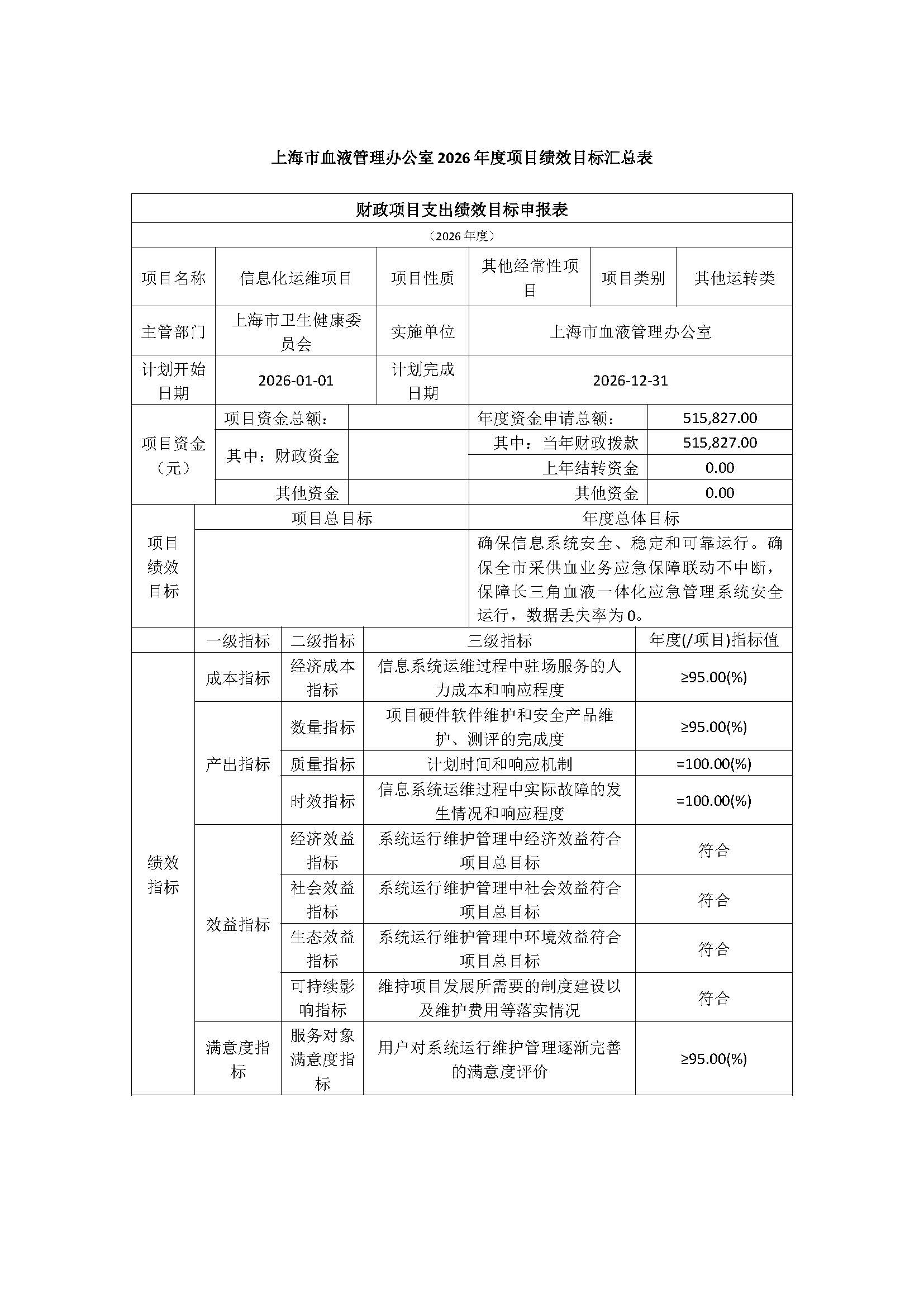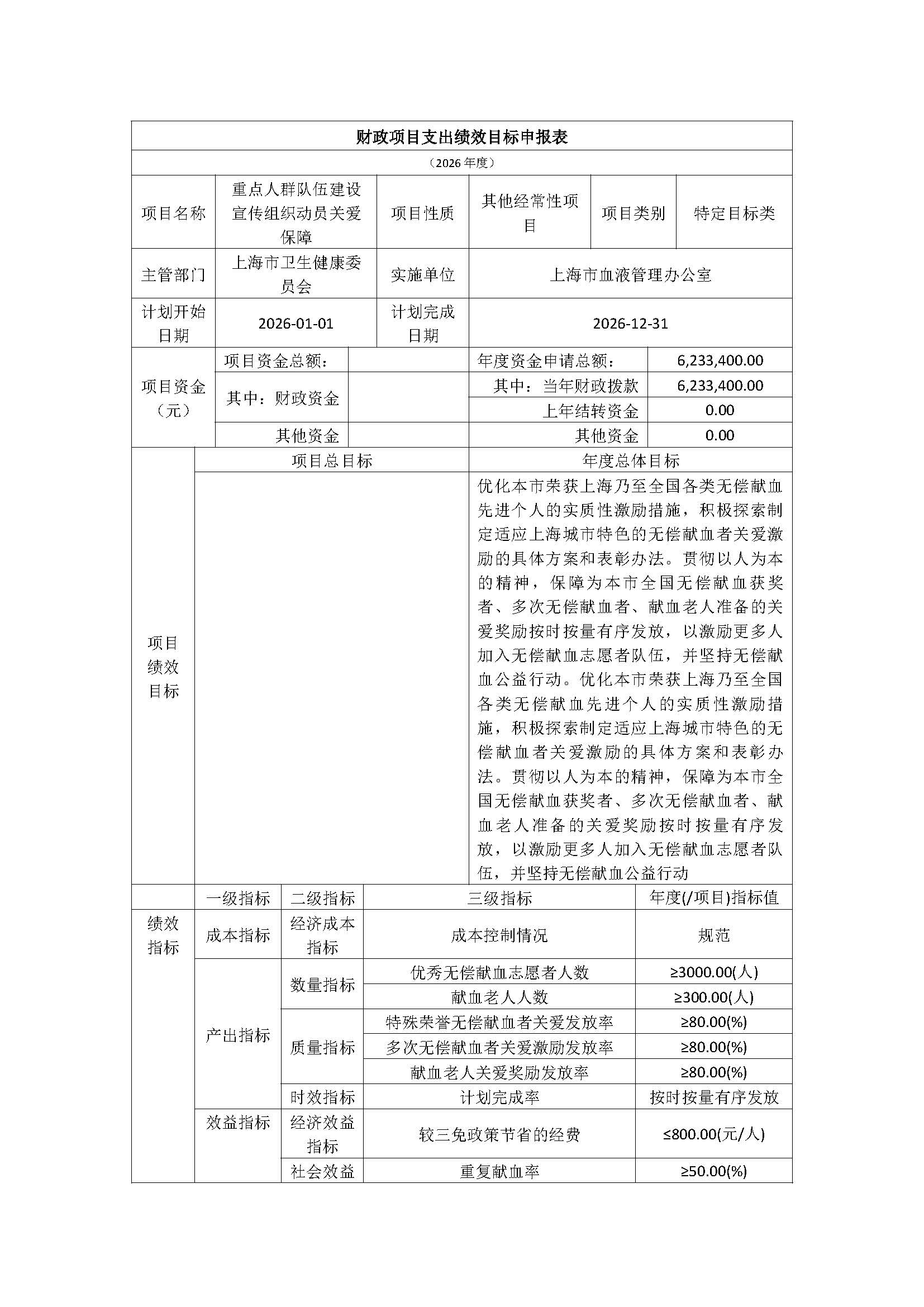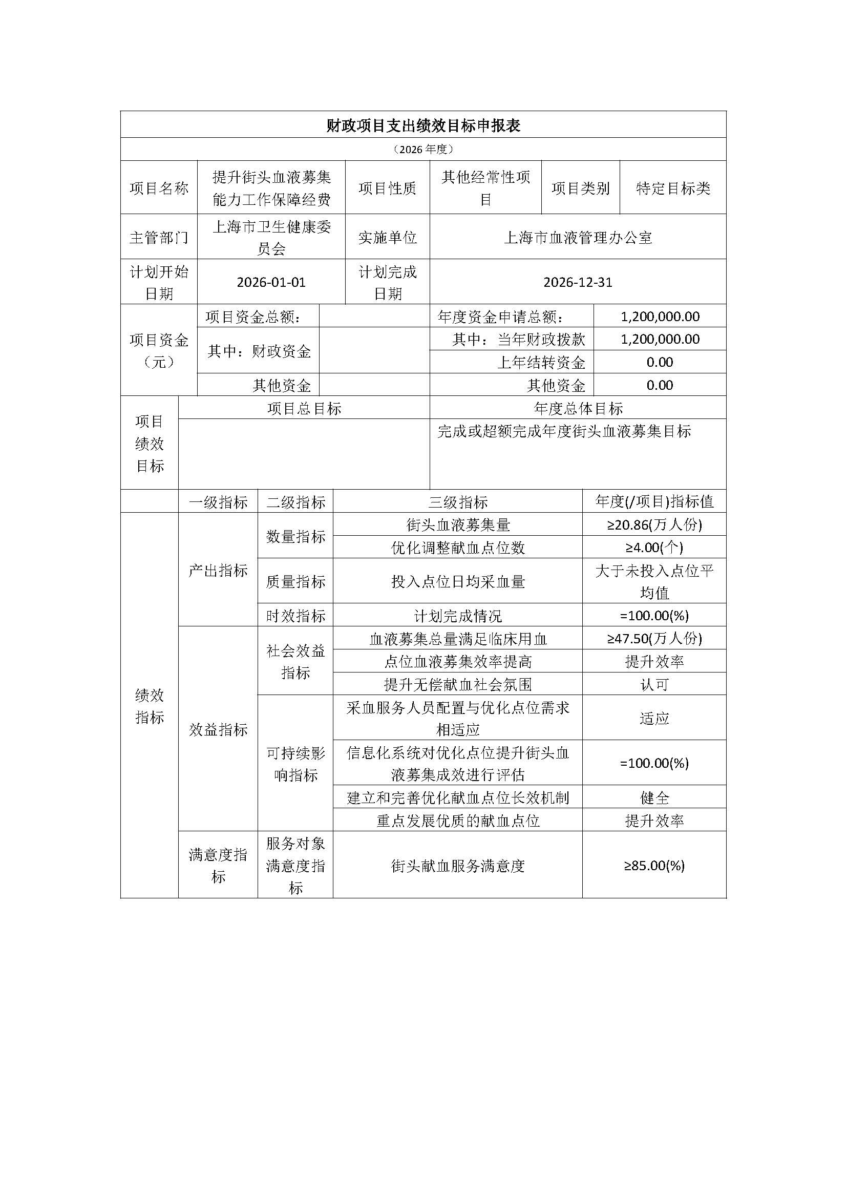 上海市血液管理办公室2026年度项目绩效目标汇总表