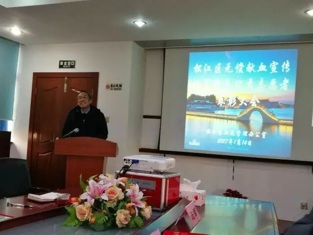 1月14日松江区血液管理办公室召开无偿献血宣传招募服务优秀志愿者表彰会。2016年度松江区无偿献血宣传招募服务队志愿者参加会议,松江区卫计委党群工作科科长卢光耀代表卫生系统志愿者参加了会议,上海市血液管理办公室质量督导部部长张统宇、综合服务部部长徐茹怡、血源统筹部部长王玮出席会议,由松江区血站书记陆军主持。