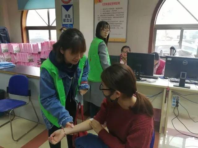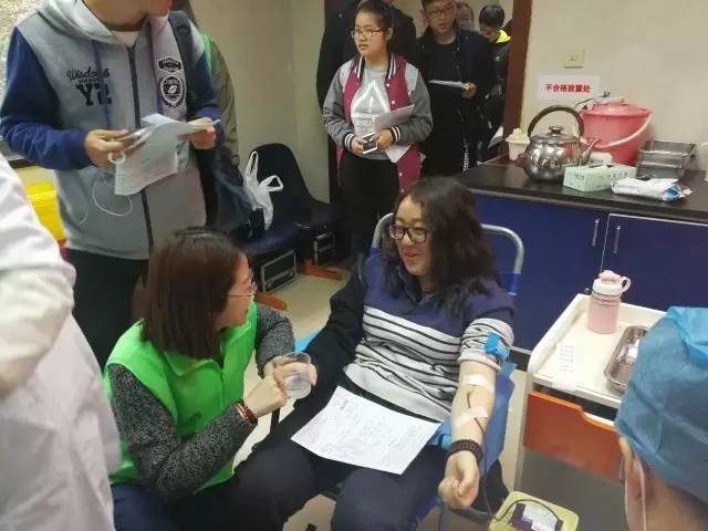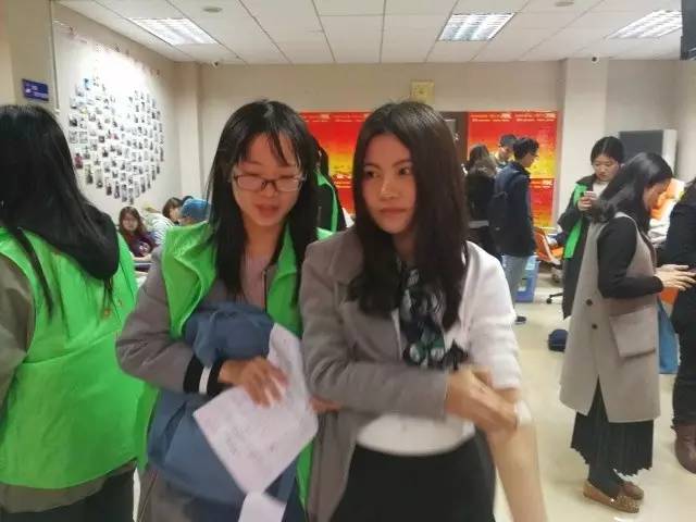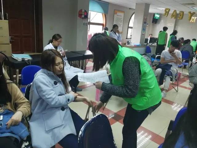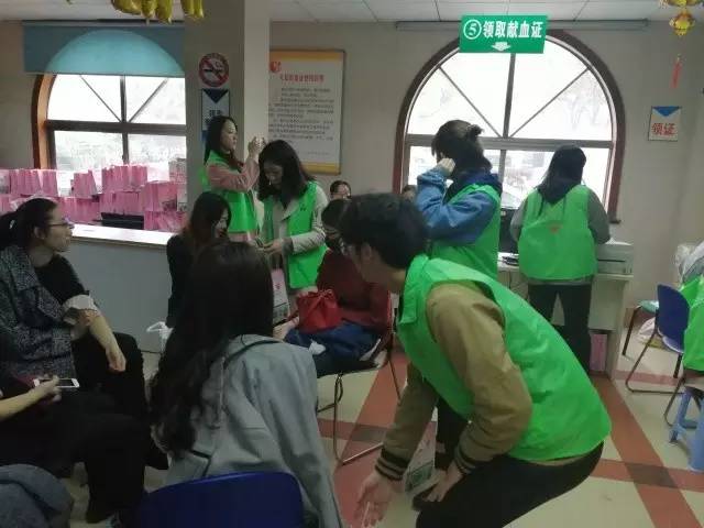 上海对外经贸大学的红十字会志愿者身着绿马甲忙碌在献血活动现场。有的“绿马甲”为献血者指引、维持现场秩序,有的搀扶献完血的同学到座位上休息,有的为献血者倒上一杯热水,还有的帮助领取献血证和礼品。