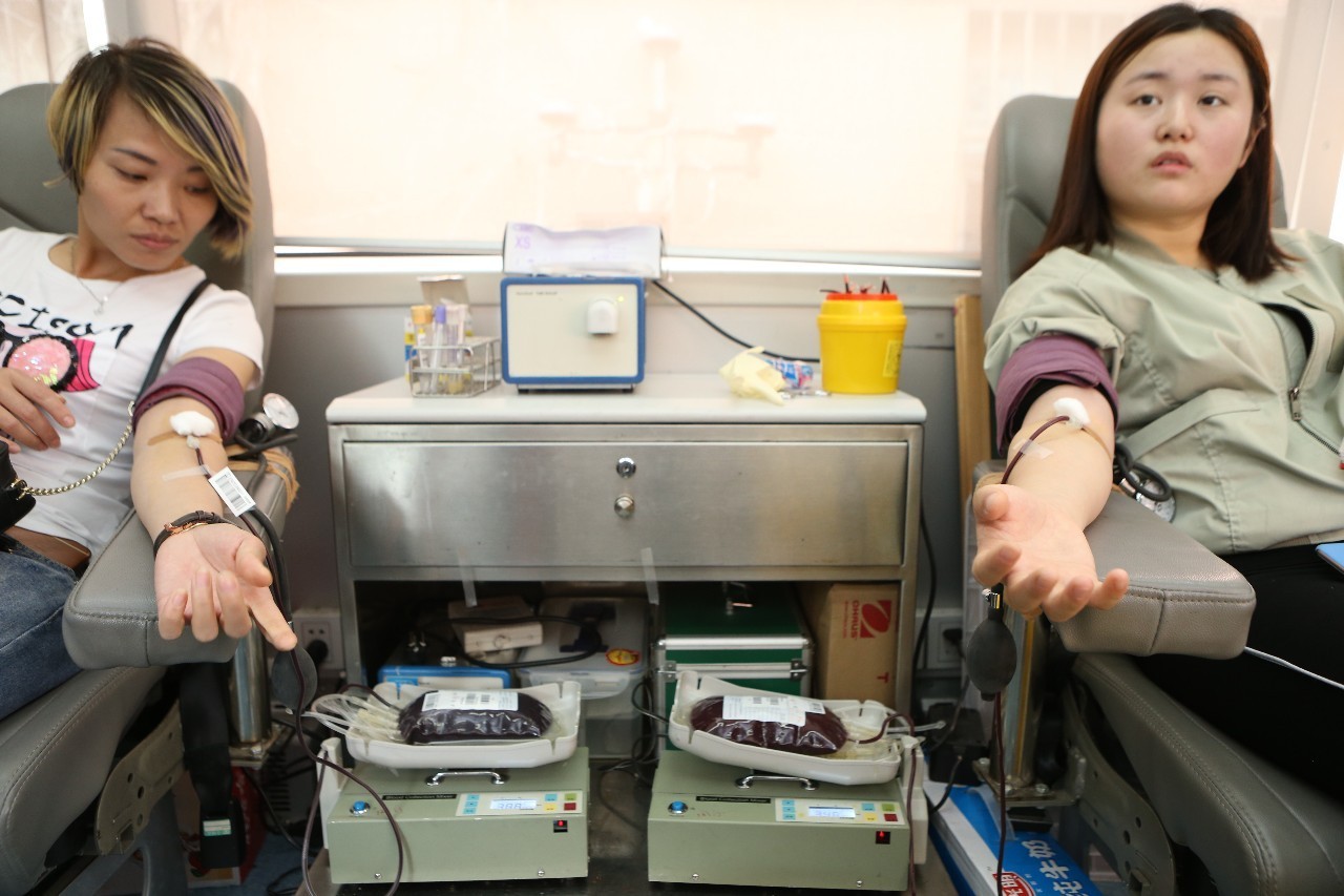 临近结束,身为好姐妹的闫静静、张颜颜、邹春桃赶来了,年轻的她们体检合格后二话没说分别献血400ml。止血、休息后,三人说笑中离开现场。