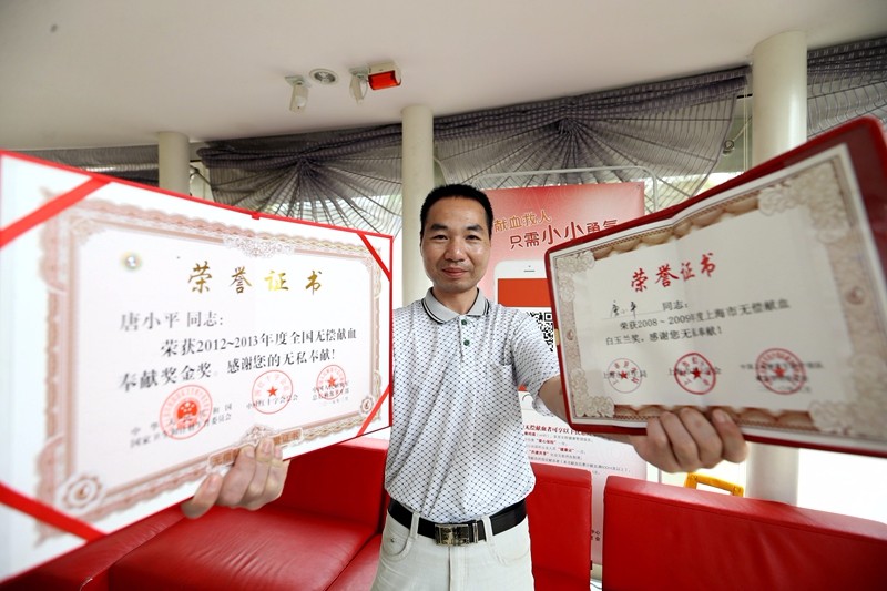 2007年9月,唐小平来到上海,出来开阔下眼界,想多学点东西。此时,他已在福州无偿捐献全血、血小板达37次。