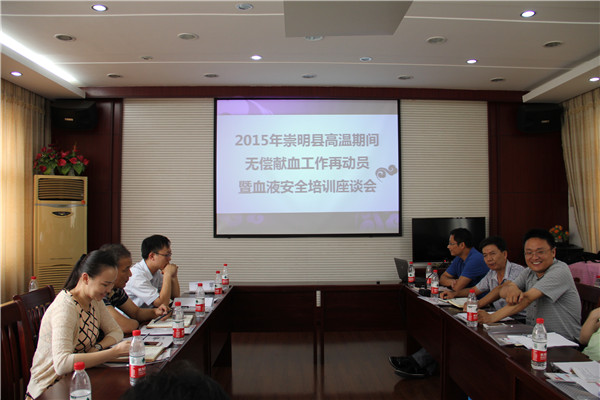 2015年8月13日下午,崇明血站组织召开“2015年崇明县高温期间无偿献血工作再动员暨血液安全培训座谈会”。卫计委施志琴副主任、公安局治安大队朱建平副大队长、血站范学东站长、卫生监督所陈科长及全县12个乡镇的事业办主任等参加了会议。