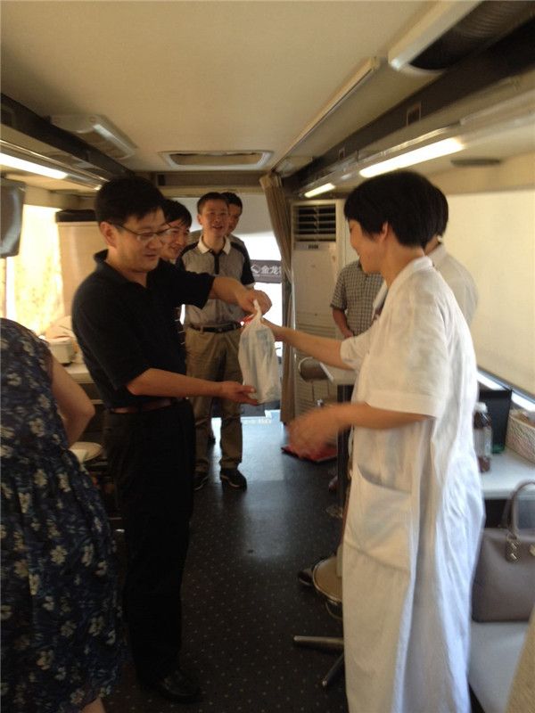 血站采血车工作人员接过蔡主任和邢书记手中的防暑用品,对局领导的关心工作人员表示了由衷的谢意,一致表示要坚守自己的岗位,坚持不懈地与高温作斗争,保质保量的完成采血任务。