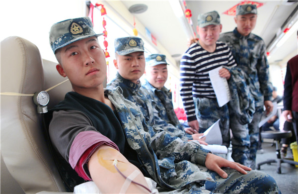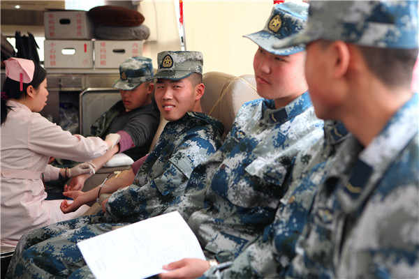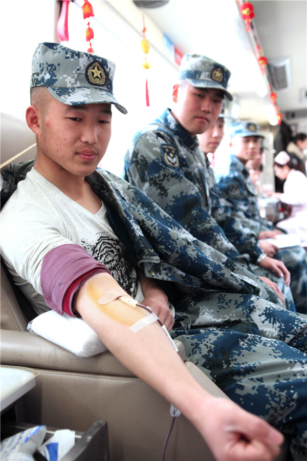 第二次参加献血的列兵李宏宇 ,没参军时就无偿献血过400毫升。填写献血登记表、体检、等待、献血,可谓是轻车熟路。“作为一名军人,无偿献血应该走在他人前列;在这个特别的日子里,更要以实际行动向雷锋同志学习。”李宏宇这样说。下士董英杰是第一次参加献血,他表示;能用自己的一袋血液挽回他人宝贵的生命,心里感到无比的自豪。短短的一个上午,就有40余名战士捋袖献血。
