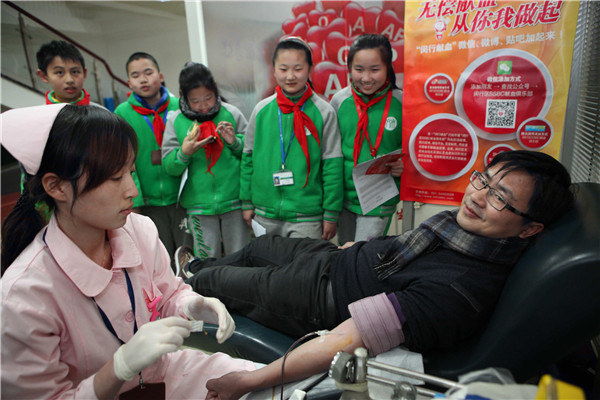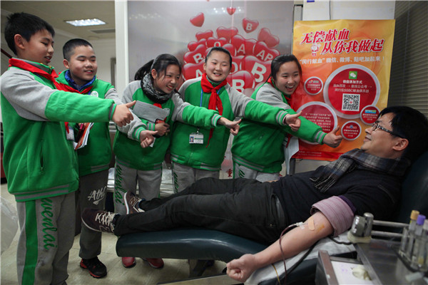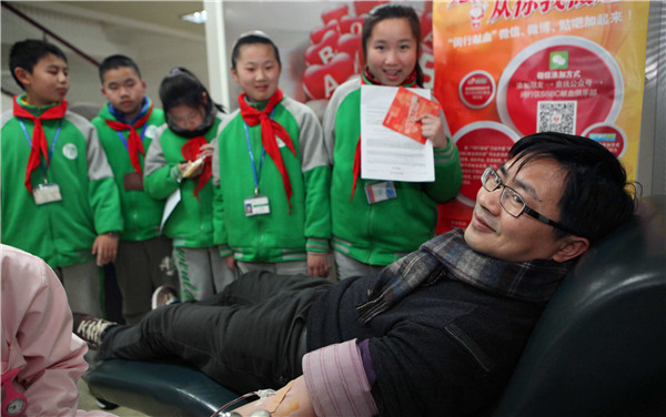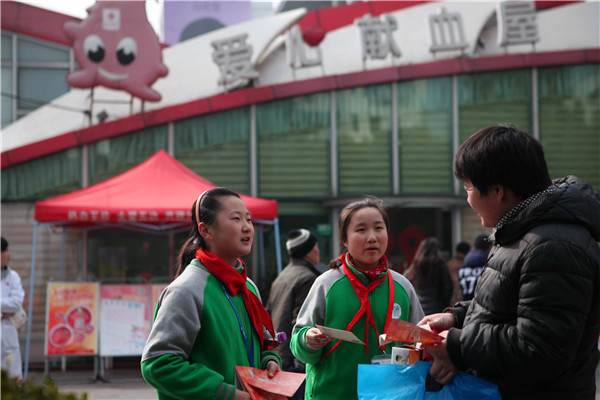 听完采血护士的讲解、看过乔易爸爸乔士平献血过程,同学们对献血有了进一步了解。各自手握一叠献血宣传资料结伴到室外,有模有样地向来往行人宣传无偿献血。大家看到因为天气寒冷献血的人不多时,一致表示长大成人后也要参加无偿献血帮助他人。