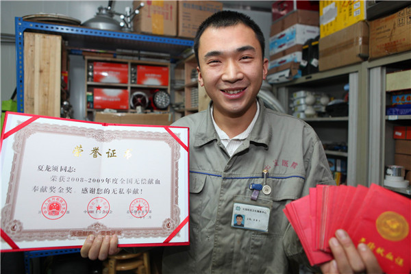 近日,被大家尊称为“献血达人”的上海闵行固定献血者夏龙须荣获了2010-2014年度上海市劳动模范,一时间被传为佳话。13年来,他无偿捐献全血、血小板达136次。夏龙须说,捐献的血液让别人能获得生存的机会,自己感到很满足。