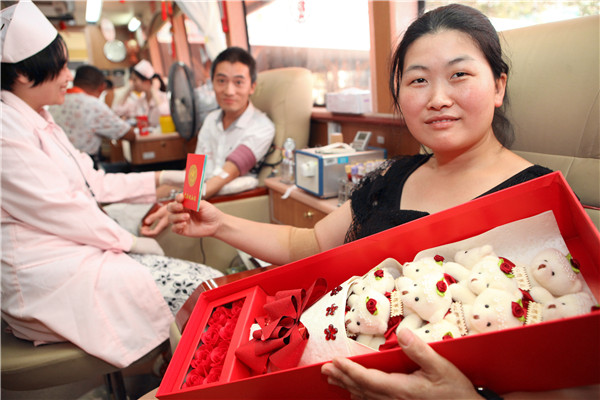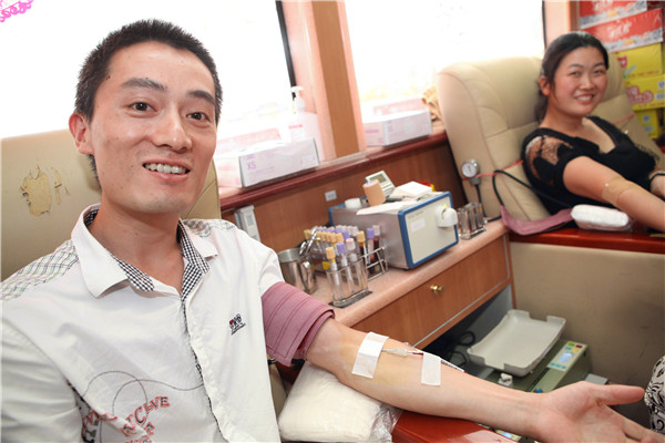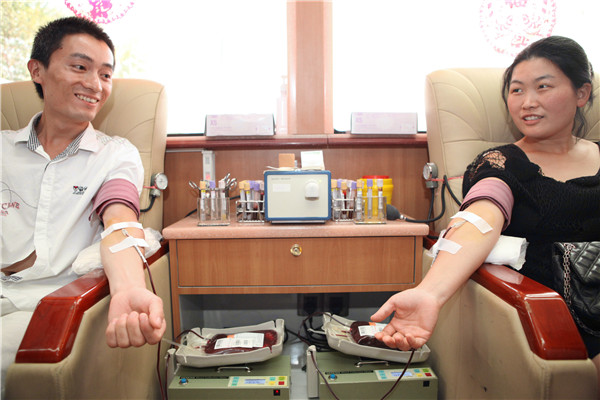 2015年8月19日,上海。“七夕”,自古以来被中国人认为是最具浪漫色彩的节日。8月20日又逢“七夕”,在爱心引导下,令人心醉的节日温情已逐渐向社会公益事业延伸。这不,在上海闵行献血点,就看到一些爱侣牵手或陪伴自己的另一半参加无偿献血,希望以献爱心的方式庆祝这个浪漫的日子。“80后”爱心夫妻李谭求、涂志平就是其中一对,双双无偿献血400毫升,希望通过献血帮助他人的实际行动诠释别样浪漫。