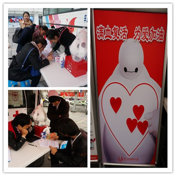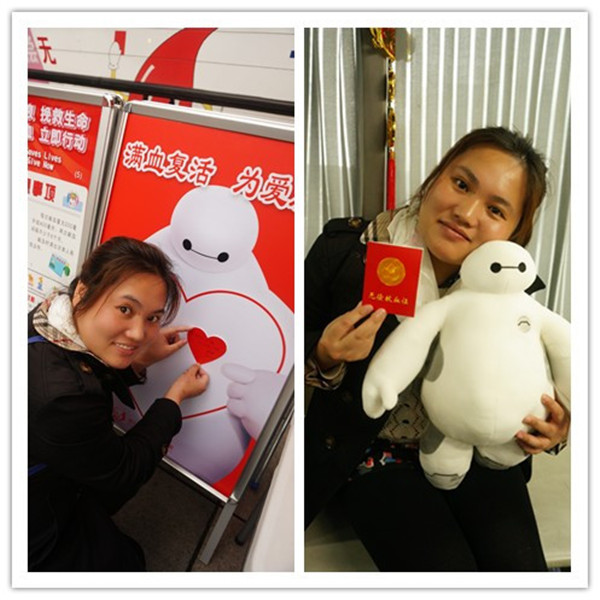 早上,志愿者们早早来到位于六百广场的流动车旁布置,还放上了现在最流行的大白公仔。很多路人被大白吸引,来咨询无偿献血的相关知识。