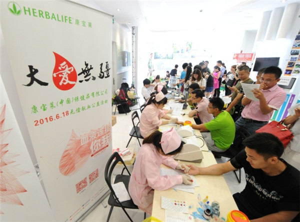2016年6月18日,来自康宝莱(中国)保健品有限公司的300多名志愿者,以无偿献血这一特殊方式来庆祝康宝莱上海店铺的第7年店庆。