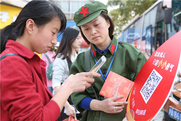 白衣天使们身着“红马甲”宣传无偿献血的身影,无疑是这个春天上海滩最美的一抹风景。3月5日,来自马桥社区卫生服务中心的沈文英、江川社区卫生服务中心的诸志英、闵行区120急救中心的季新军等来到就近采血点,身着“雷锋装”、肩挂“为人民服务”字样的军绿色书包、手举无偿献血二维码宣传牌,向市民宣传无偿献血帮人帮己的理念。19日,闵行区卫生学校的朱鸿辉、鲍军萍来到莘庄地铁南广场献血车,参加比武活动,荣获当日比赛第一名。活动刚结束,早已爱心爆棚的朱鸿辉迫不急待地走上献血车,捋起衣袖奉献出自己的一份热血。4月10日,龙柏社区卫生服务中心的刘旭绛和另一名参赛队员不约而同地带着各自的孩子,来到献血点一起宣传无偿献血。孩子们的加入,引来不少路人关注的目光。5月1日,吴泾医院骨科医生贾学武博士在一天的招募工作结束后也欣然献出400毫升热血。 浦江社区卫生服务中心的翁晓雯多次到献血点和队员们一起宣传。七宝社区卫生服务中心的罗佳、顾蕾是一对好闺蜜,五一假日放弃休息,三天共动员了近50人参加献血。参赛队员大多都有献血经历,大家借助自身医者专业知识现身说法,为对献血有顾虑的人一次次解疑释惑。