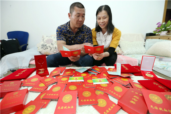 说起献血,赵秀莲从抽屉里取出一个其貌不扬的纸盒子,拿到茶几上打开来,让人震惊。62本鲜红的献血证记录着夫妻俩多年来的献血经历,20多件无偿献血荣誉证书、奖牌,诉说着夫妻俩的无私大爱。