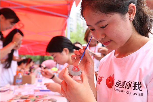活动现场设置了爱心彩绘、剪纸、手绘石头画、香囊定制等互动区域。与会者饶有兴致地一个个摊位参与,大家或剪纸或绘制石头画或制作定制行囊,不少人还将脸上、手臂上彩绘上爱心元素,处处都能看到“闵行献血”的LOGO和吉祥物帮帮蜂。大家通过参与各个活动,并与拍照道具合影后发朋友圈,获得一枚帮帮蜂印章,根据获取的帮帮蜂印章现场换取纪念品。