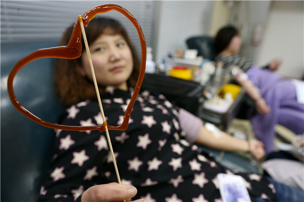 “我要一个爱心糖画、我要一个帮帮蜂糖画……”为了给假日里献血者增添乐趣,闵行区血液管理事务中心、闵行区献血促进会首次邀请了民间糖画艺人,在各采血点设摊制作糖画,赠送献血者。传统工艺文化深受大家的喜爱。一时间引来众人围观,在七宝献血屋糖画摊前竟然还有老外目不转睛地看糖画艺人制作糖画。