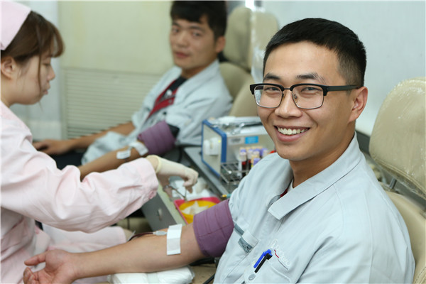 中午时分,献血车又驶进了北斗路上的第二工厂。第一次参加献血的孙程阳刚坐上采血椅时,显得有点紧张。当看到自己的血液缓缓地流进血袋时,他笑着说:“献血,没有想象中的那样可怕嘛!”身材魁梧的谭懿伸出手臂就献出400毫升鲜血,这是他第八次无偿献血了。献血中,谭懿还不忘给初次献血的同事“普及”献血知识。