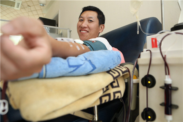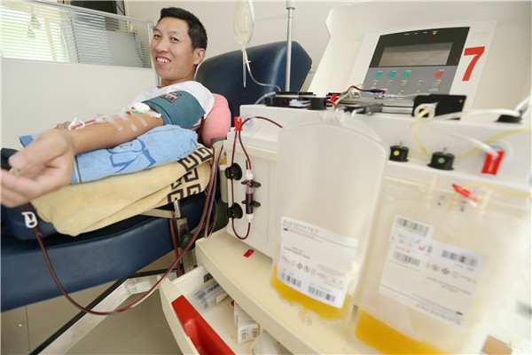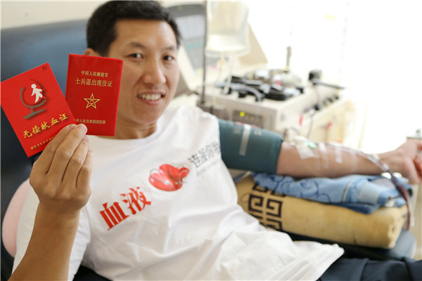2016年7月28日,上海。“这是我第90次献血了,这次捐献的是双份血小板。我喜欢每次献血都领一本新的献血证,90本放在一起感觉特光荣。”7月28日,退伍军人、固定献血者程少海身着印有“血液来接你我”字样的白色T恤,冒着40度度的高温来到上海市闵行区梅陇爱心献血屋再次献出血小板,以此庆祝即将到来的八一建军节。他一边捐献血小板,一边还认真地在献血证的右上角写下数字90,特意为自己的献血次数做标记。
