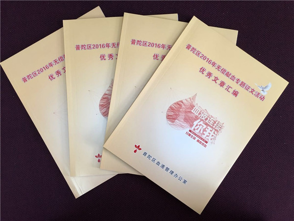 为纪念第十三个“世界献血者日”,弘扬无偿献血无私奉献、分享生命、大爱无疆的崇高精神,不断提高全社会对于无偿献血事业的关心、支持和参与,强化血液与挽救生命的紧密关系,交流和分享无偿献血志愿者在无偿献血中和志愿服务中的“所思”、“所见”和“所感”,我区于今年上半年组织举行了“2016年普陀区无偿献血工作‘血液连接你我’主题征文活动”。本次征文活动得到了全区企事业单位和街道镇的大力支持和积极参与,投稿踊跃,共收到征文141篇,内容涉及无偿献血、志愿服务和献血管理等方面。经征文评审专家组综合评审,共评选出十佳征文10篇,优秀征文20篇,优秀组织奖3名,积极组织奖9名。