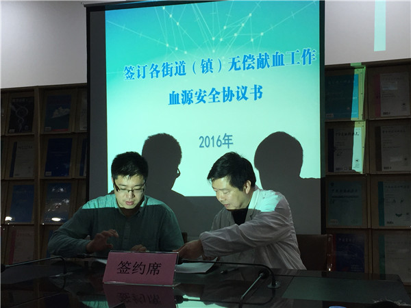 会上,区血液管理办公室和各街道(镇)签订了《2016年普陀区无偿献血血源安全协议书》