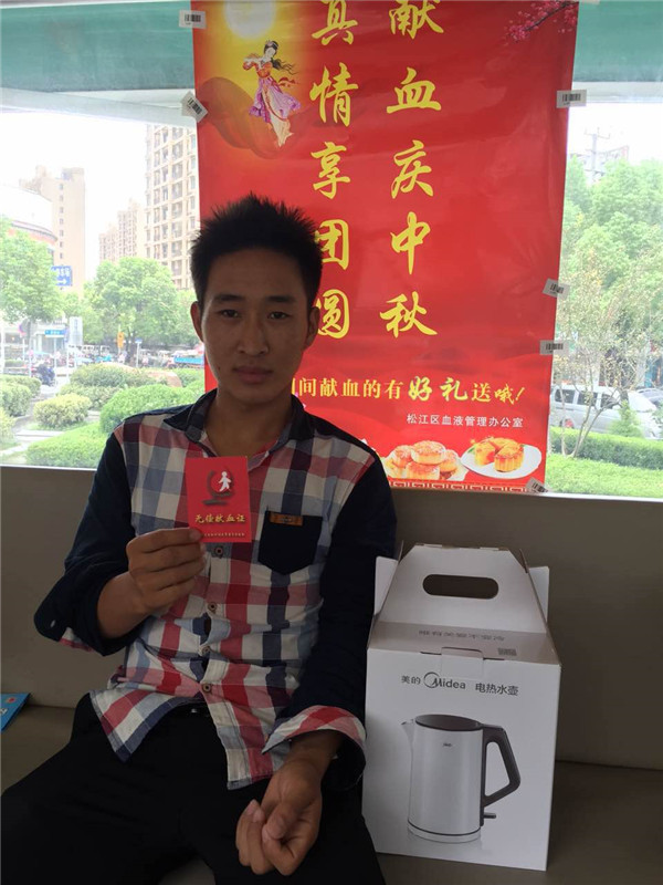 孙志兴,江西樟树人,今年3月5日举着学雷锋牌子在流动车献了400毫升,这次在中秋佳节手执新版献血证又献血400毫升,拿到精美礼品一份。