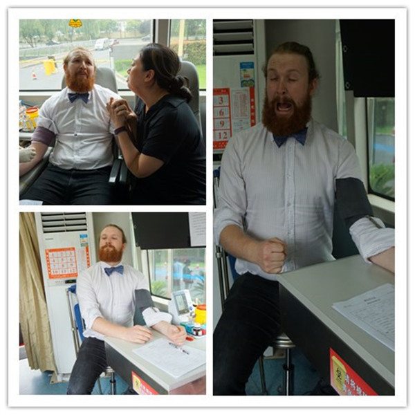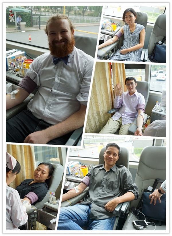 在志愿者中有位来自加拿大金发碧眼的Kennedy Graeme,一上车就用事先准备好的单反拍个不停,体检和抽血时各种搞怪的表情,和偶尔“蹦出来”的蹩脚的中文,逗得车上的人笑个不停,当他让大家猜测他的年龄时,全场没有一个人猜到满脸胡须的他才年仅25岁,他说这次是他的第一次献血,他很高兴能来到中国,并奉献出了他的“第一次”(献血),他感到很自豪;还有一位来自菲律宾的Dominc Penaloza,今天也是第一次参加献血,他操着一口流利的中文,和工作人员全程交流无障碍,献血时他还不忘记拿起手机开始了自拍,他说他想留张照片,纪念一下这个特殊的时刻,对着工作人员的镜头,他说:“love Shanghai,love China。”;最后献血负责人也走进了献血队伍,捋袖献血400毫升,他幽默的对工作人员说:“快看看我的血型和老爸老妈的血型合不合?我想知道是不是亲生的!”全场爆笑,就这样在轻松幽默的氛围中完成了此次献血活动。