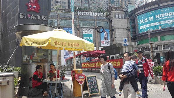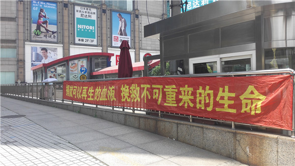 献血屋入口处,一条印有“捐献可以再生的血液,挽救不可重来的生命”的宣传主题的横幅和宣传版面引起过往行人的注意,黄色的宣传伞、红色的马甲的志愿者手中的铭牌,都营造出了良好的无偿献血宣传氛围。
