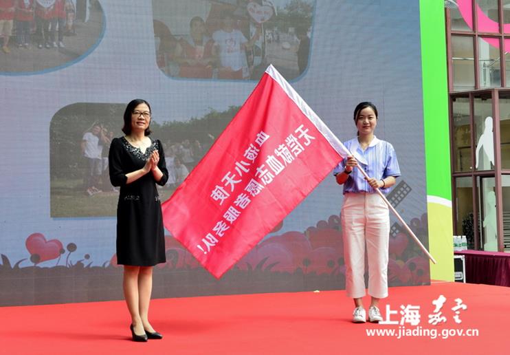 活动上,嘉定区卫计委主任方云芬为上海科学技术职业学校“血液小天使”志愿服务队授队旗。