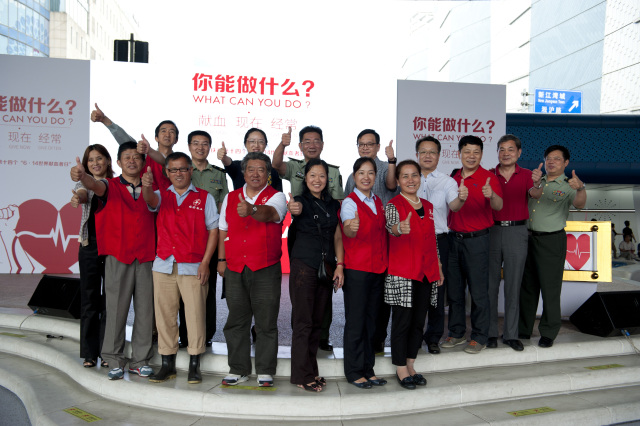 6月13日上午,由杨浦区卫计委主办的庆祝第十四个世界献血者日暨献血宣传月启动活动在五角场广场举行。定期献血者、献血宣传者120余人受邀参与活动,共庆这一充满意义的爱心节日。