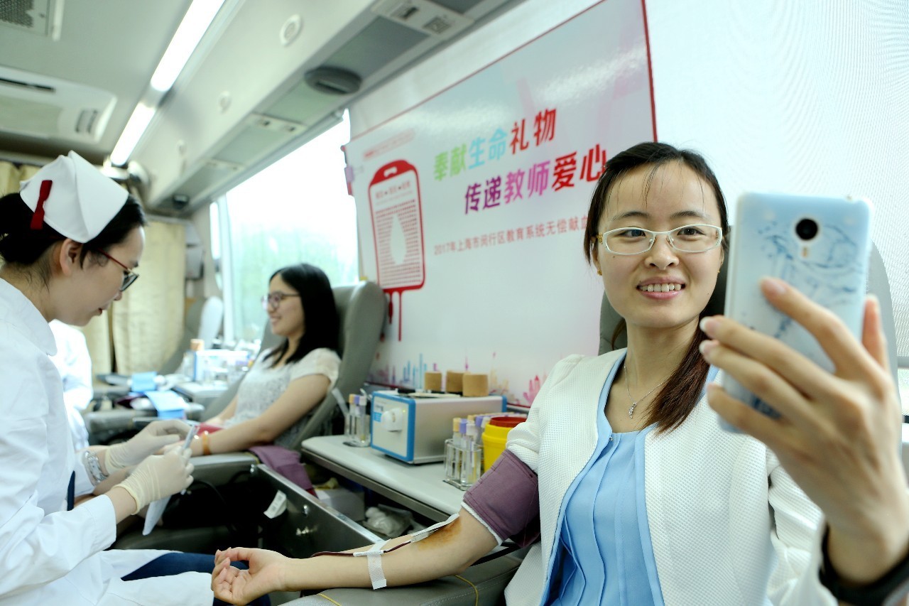 弘梅小学的语文教师王玉兰也和同事一起赶到梅陇爱心献血屋,争相献出各自的热血浓情。闵行区青少年实践教育基地的董慧看上去很苗条,已是第3次献血了。她边献血边用手机自拍,不忘将自己献血画面发送到微信朋友圈。同样是第3次献血的还有田园外语实验小学的英语教师陈楠,她从大学时开始参加献血。上海交通大学附属第二中学医务室的廖水梅已是第5次献血,54岁的她说:“作为医务人员,比常人更知道血液对挽救病患的重要性。”