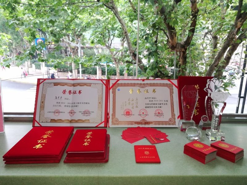 为此,自1996年首次参加无偿献血以来,老高已在21年中累计参加无偿献血194次,其中全血31次共11000ml;血小板163次共194人份。而他也因此在2006年至2015年间,连续5次获得“全国无偿献血奉献奖金奖”称号;2008年至2015年期间,连续4次获得“上海市无偿献血白玉兰奖”等荣誉。
