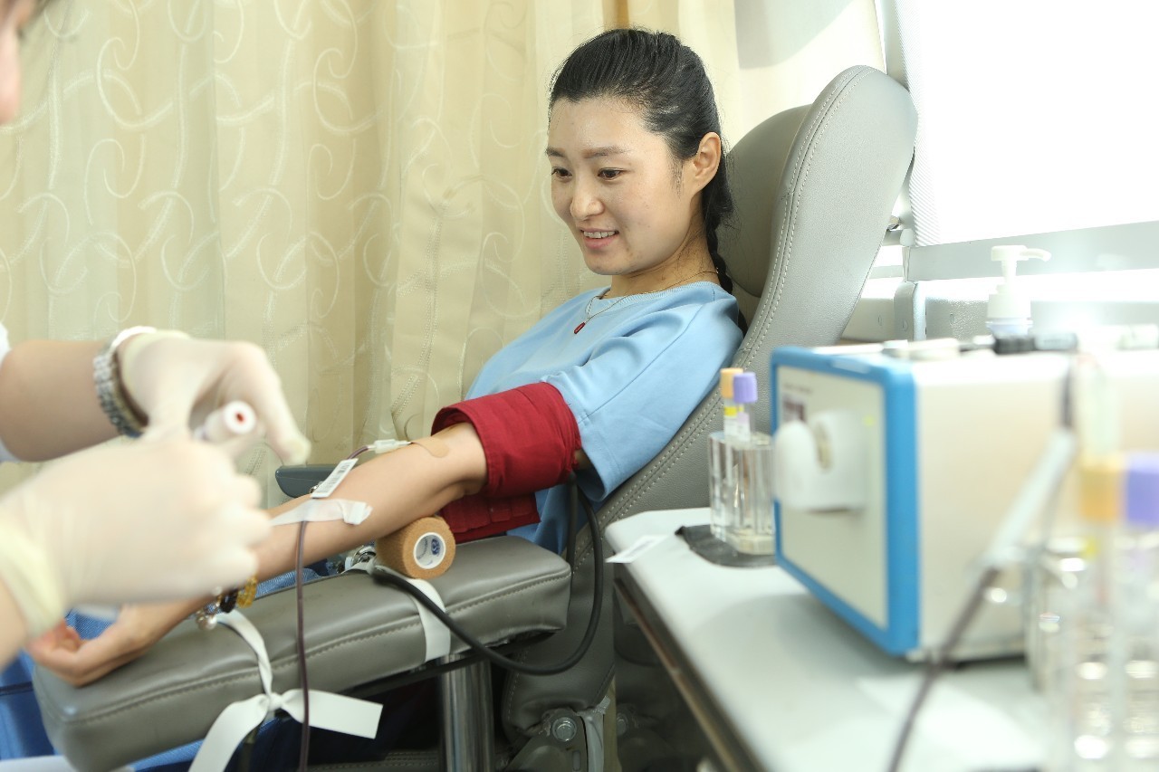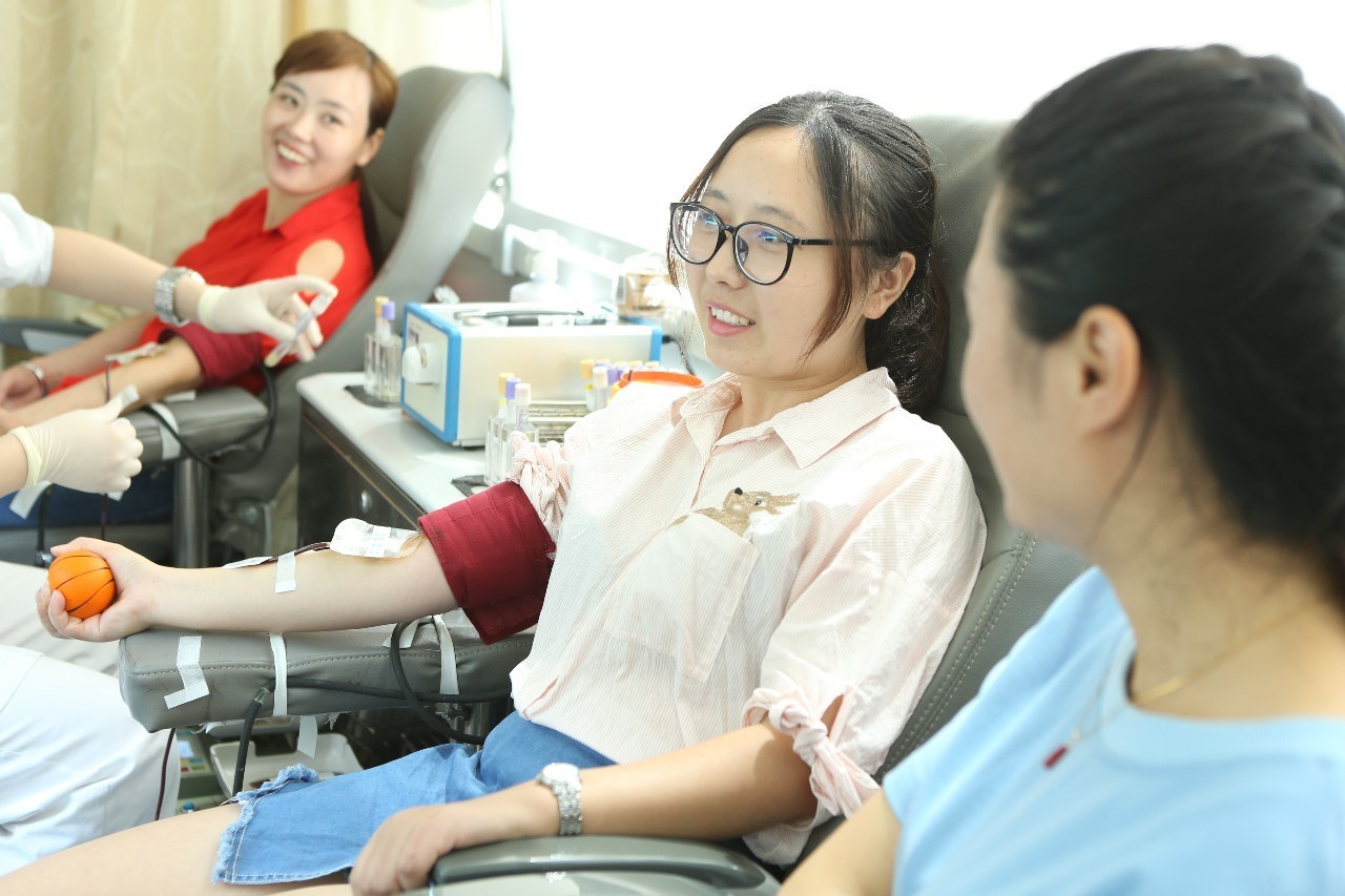 性格开朗的卜庆群在献血车上和同事有说有笑,献血时不停地用手机自拍,当听到采血护士说采血完毕时,她惊讶地问:“这么快就献完了。”从大学时开始参加献血的马文文,也再次献血400ml。这是马文文第8次无偿献血了,已累计献血达3200ml。她认为:“献血救人,不但无损健康,还能促进自身血液循环,是一举多得的事情。”参加献血的还有吴小波等10余名员工。