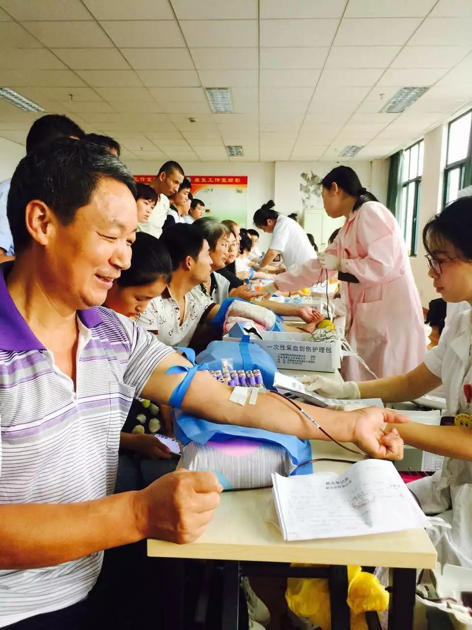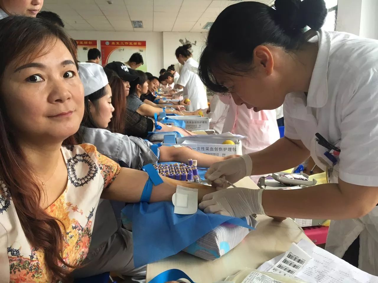 身份验证处工作人员认真的电脑验证,血液检测处严谨的进行血液初筛,确保献血安全。献血之前必须做好充足的准备,现场工作人员主动给献血者倒糖水,递饼干,不仅能补充能量,还能缓解紧张。献血过程中采血护士不时向献血者讲解无偿献血的常识和注意事项,亲切周到的服务让大家如沐春风。前来献血的献血者自觉排好队,等待着奉献爱心。