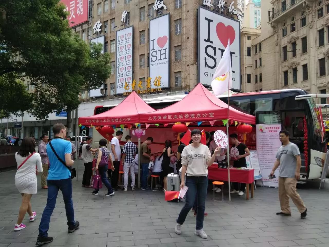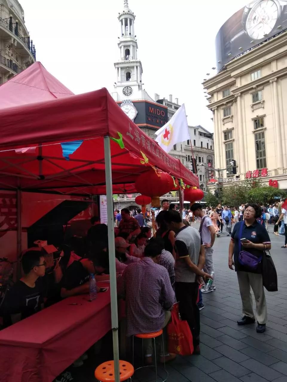 满城尽显国旗扬,国庆八天长假,南京东路步行街处处流光溢彩,装扮一新的爱心献血车也早早地来到活动现场,志愿者们搭帐篷,摆桌椅,布置好活动现场,喜迎八方爱心人士。