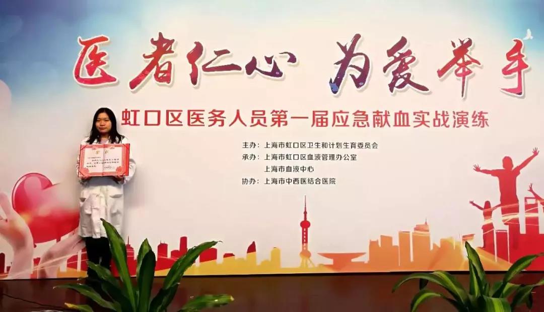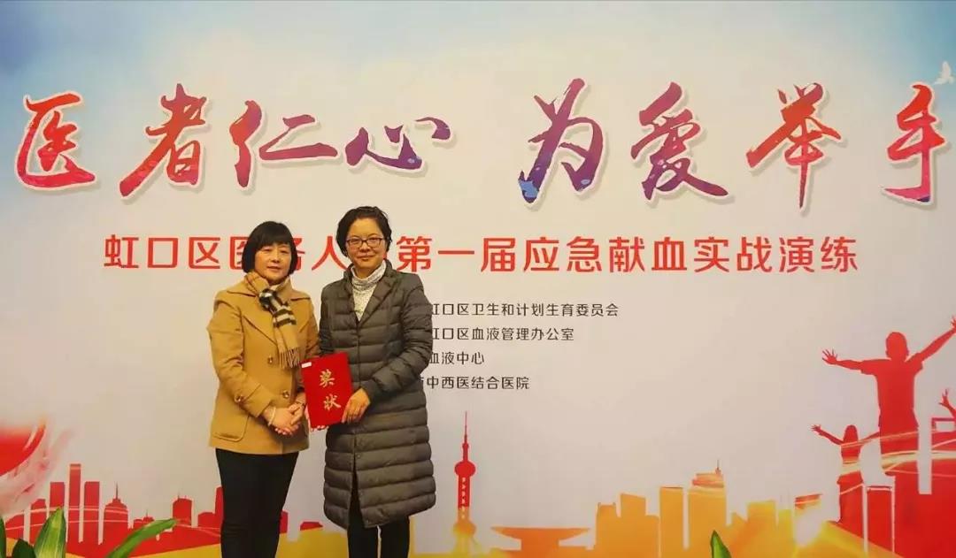 右:凉城新村街道社区卫生服务中心金雯瑜荣获2016年度上海市社区、企事业单位无偿献血工作考核优秀个人