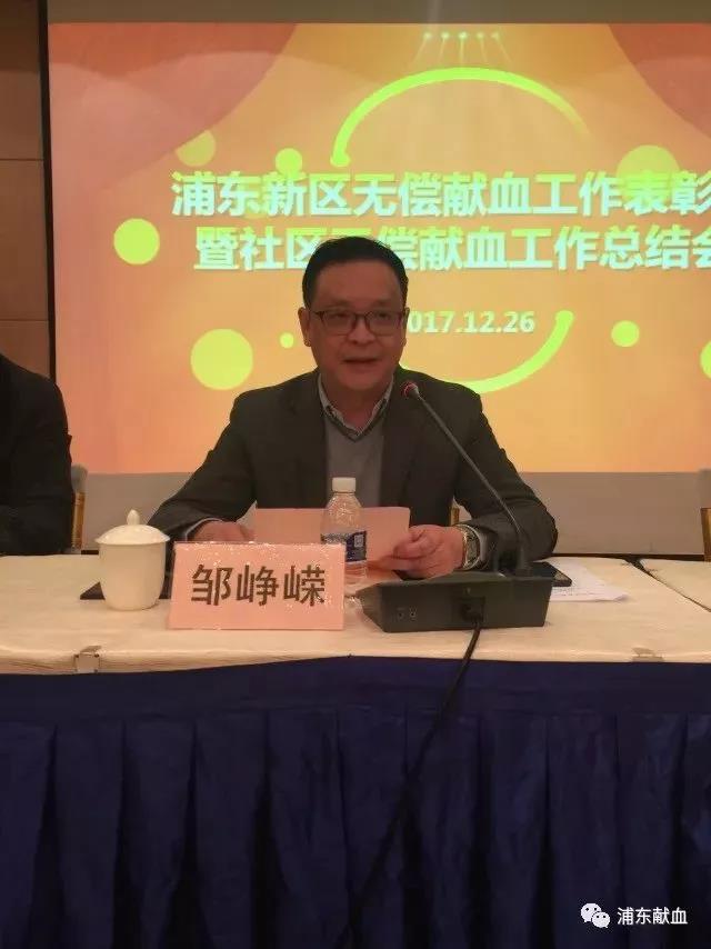 会议的最后一部分由市血管办主任邹峥嵘进行讲话。邹主任首先向各位获奖者、新区卫计委、新区血管办表示感谢。邹主任将2017年度全市的无偿献血工作进行了介绍,他重点提出了上海市血液管理所聚焦的三个点为开源、节流、保安全;今后的工作重点为补短板、寻突破、大力提升街头献血量。最后,邹主任希望大家能齐心协力,为今后的无偿献血工作贡献一份力量,为全市的临床用血提供保障。