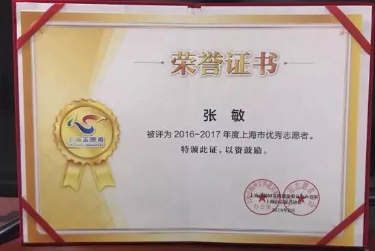 青浦区:张敏荣获2016-2017年度上海市优秀志愿者