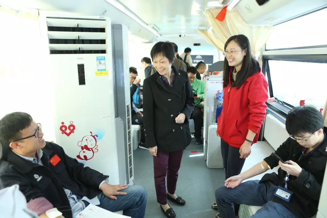 804所党委书记王乃雯、闵行区血液管理事务中心主任诸培红等领导登上爱心献血车,向参加无偿献血的职工表示真诚的感谢和亲切的慰问。王书记说:“804所每年都会动员职工‘组团’参加无偿献血,为医疗保障备血,更是义不容辞的责任。”