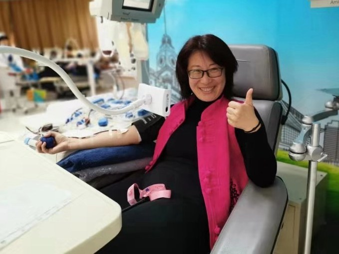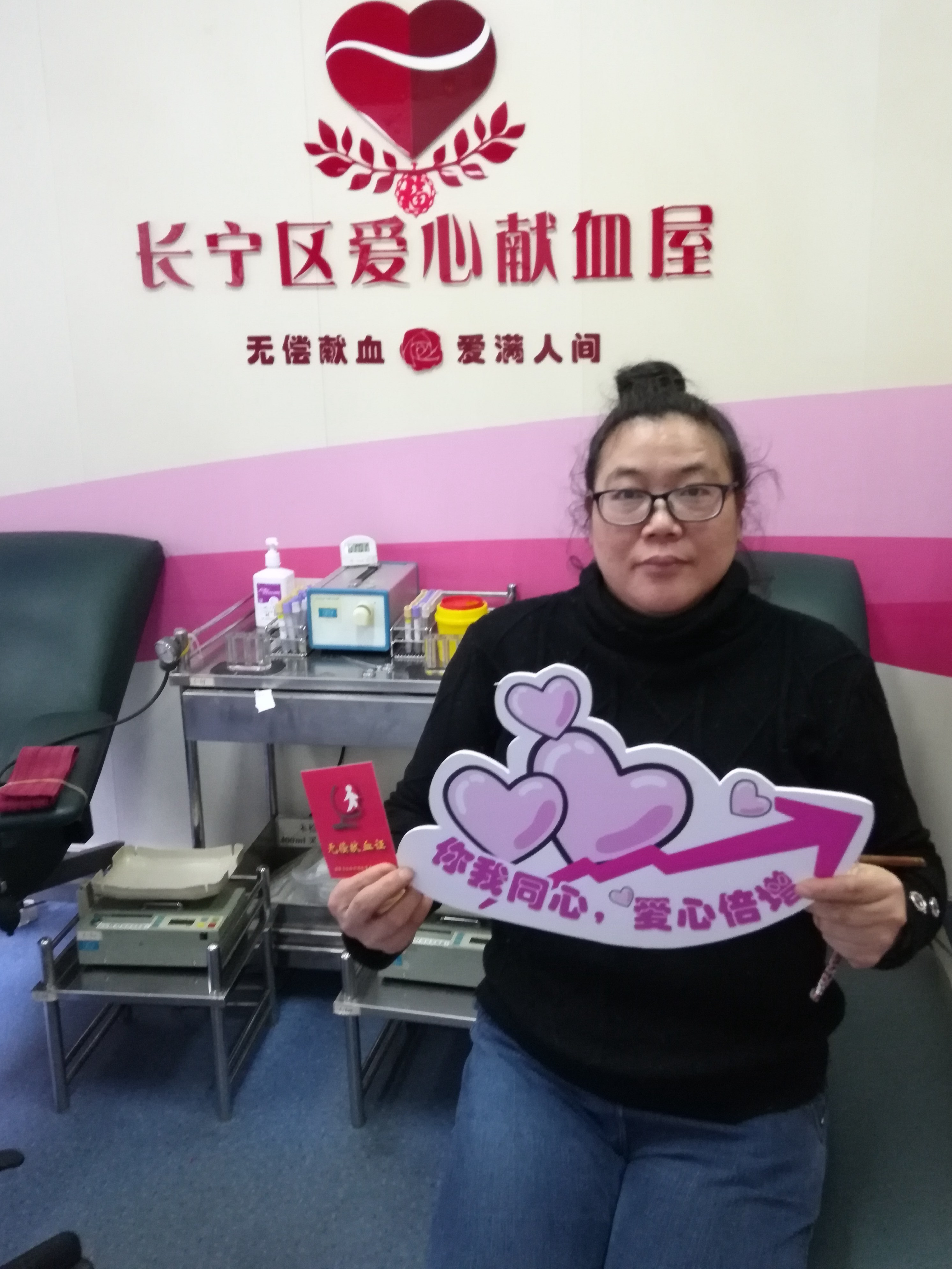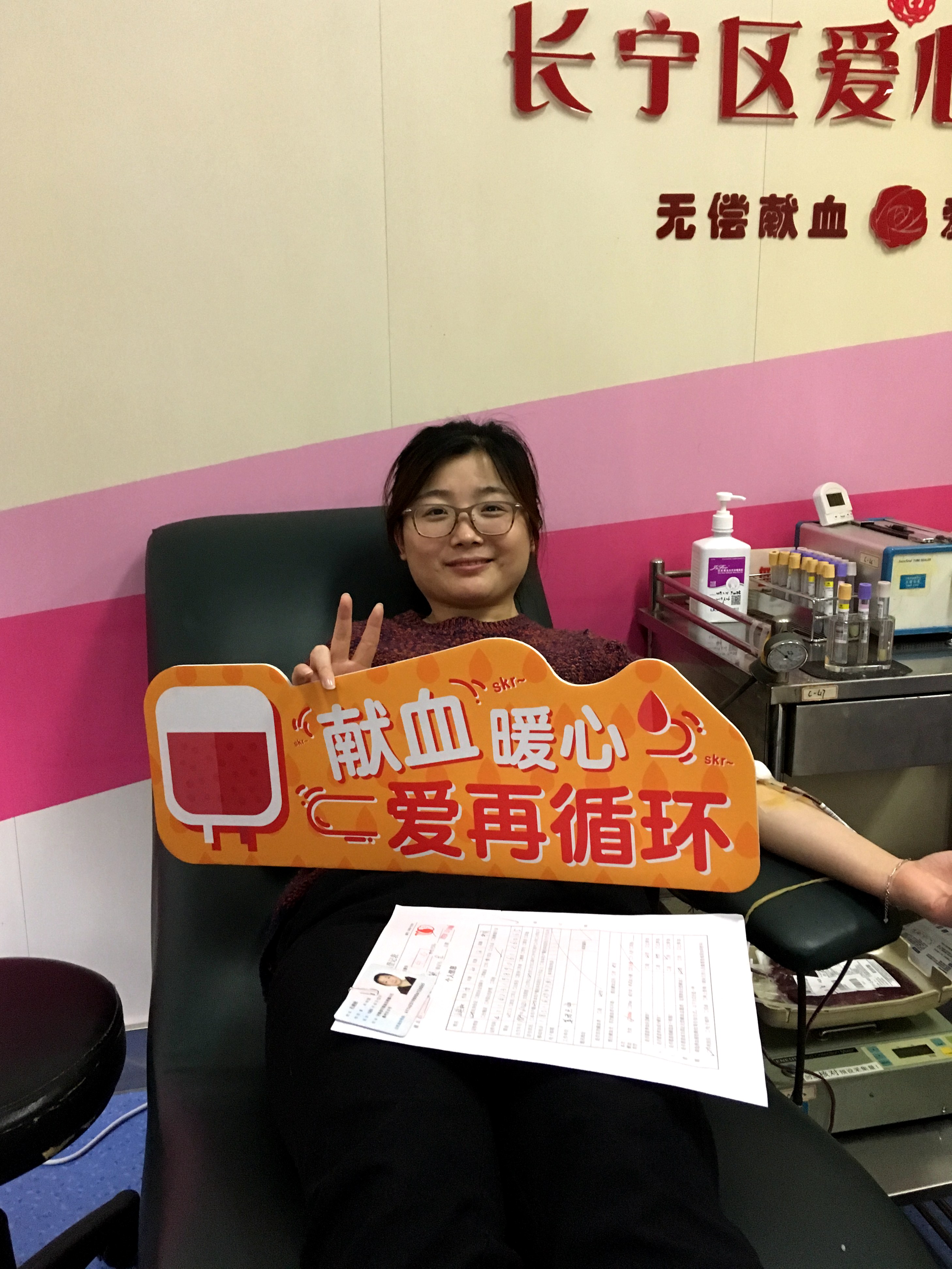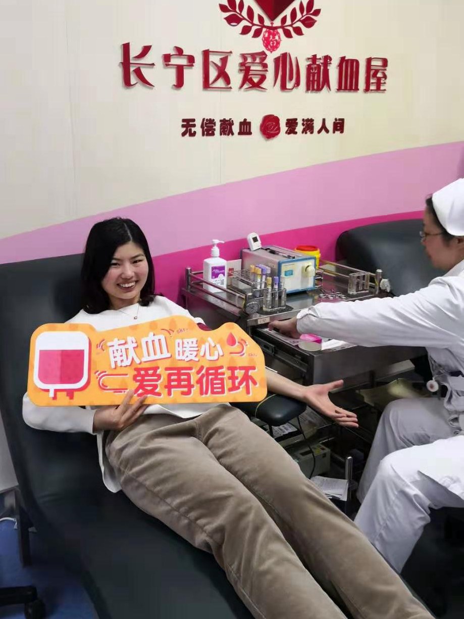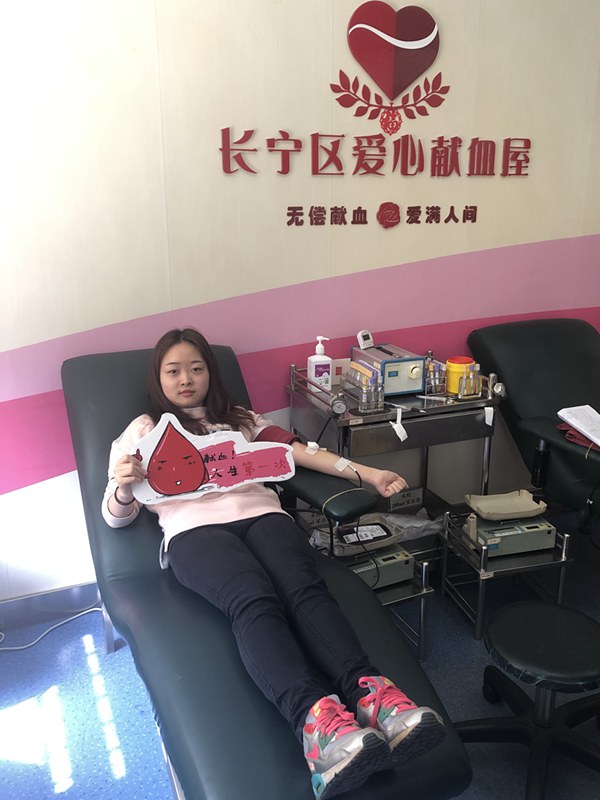 而在同一时间,长宁区无偿献血招募宣传服务队成员杨奕敏带领着她的朋友们来到上海市血液中心单采室,共同捐献血小板,杨奕敏自1994年在大学时期的第一次献血开始, 20多年里共计献血40余次,她表示:“无偿献血是一种普通人也可以身体力行的公益行为,是我们用最普通最平凡的行为,告诉身边人、告诉我们的孩子,什么叫热心助人、什么叫回馈社会、什么叫感恩与付出......”献血完成后,几位美丽的女神们用相机记录下了她们这美丽又珍贵的一刻。