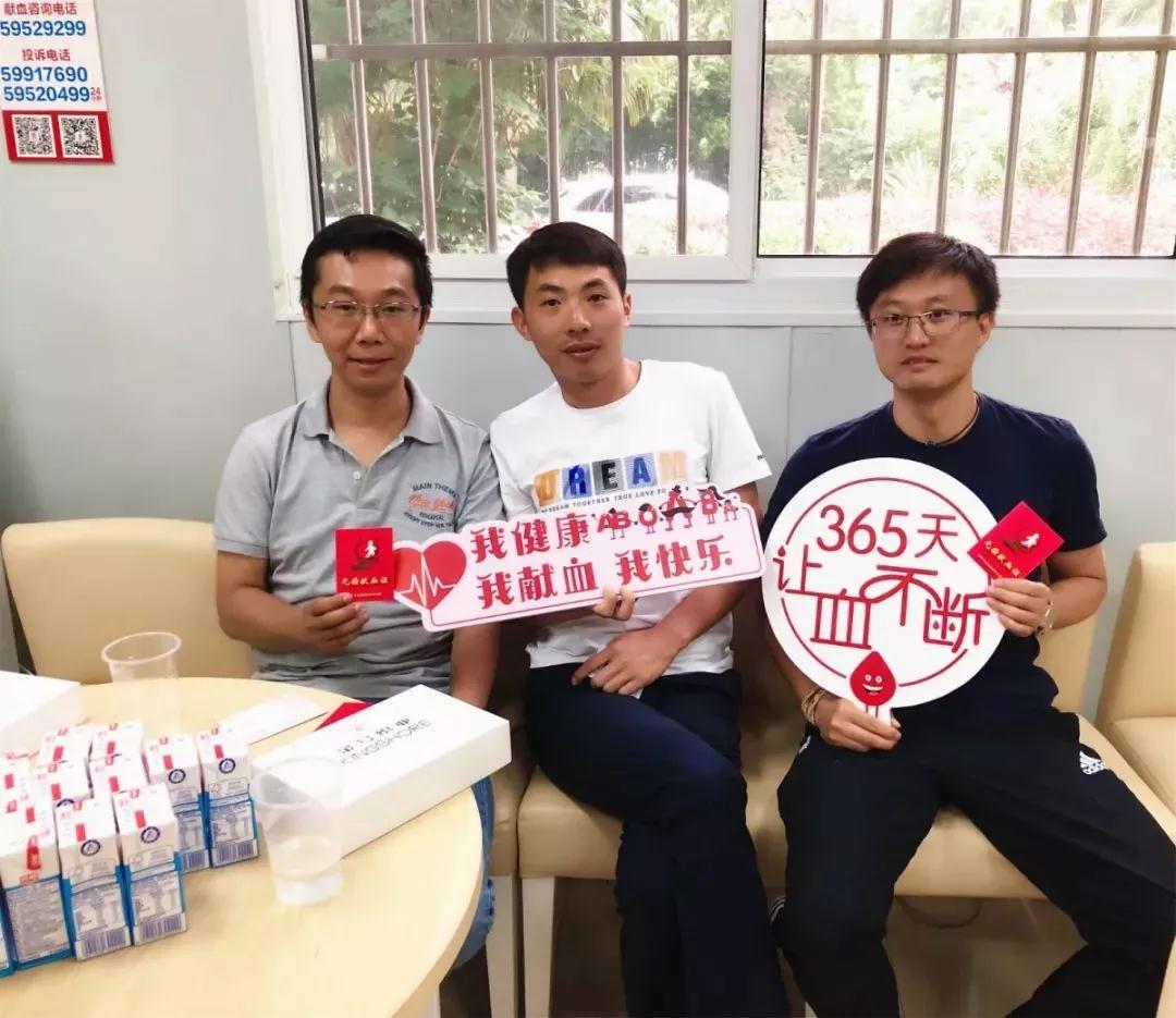 大众工业学校李君(右)、李波(左)、李继先。每年教师无偿献血专场都能见到李君老师的身影,他已无偿献血十余次,为他点赞!