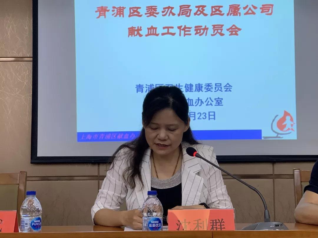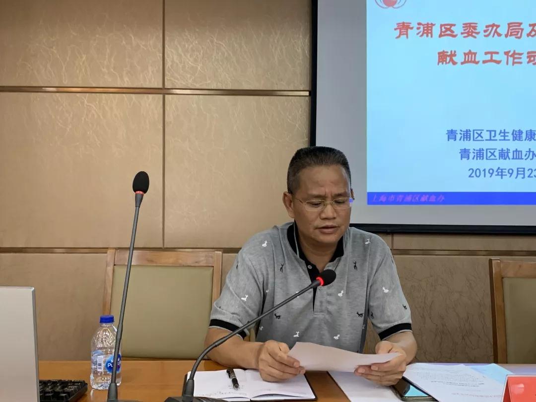 为切实做好2019年各委办局及青浦区属公司无偿献血工作,确保第二届进口博览会顺利召开,9月23日下午,青浦区卫生健康委员会、青浦区献血办公室组织召开了2019年各委办局及青浦区属公司无偿献血工作动员会。会议由青浦区献血办公室副主任、青浦区血站站长沈建国主持。青浦区卫生健康委员会医政科副科长沈利群,青浦区献血办公室计划科科长李斌到会,各委办局及青浦区属公司的无偿献血工作组织者共50余人参加会议。