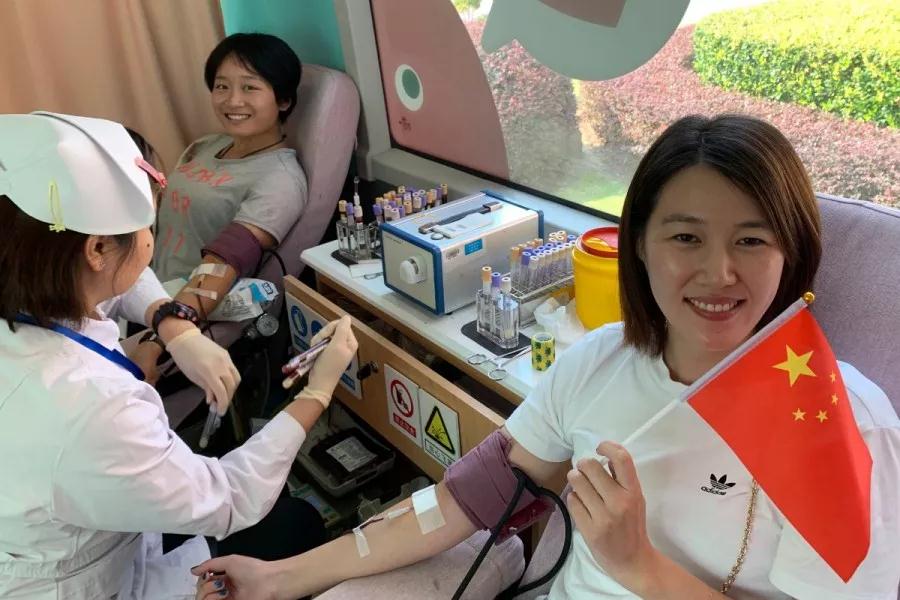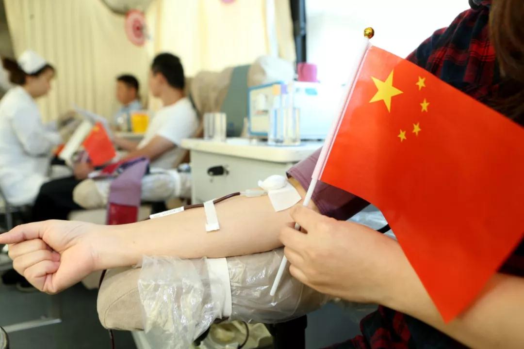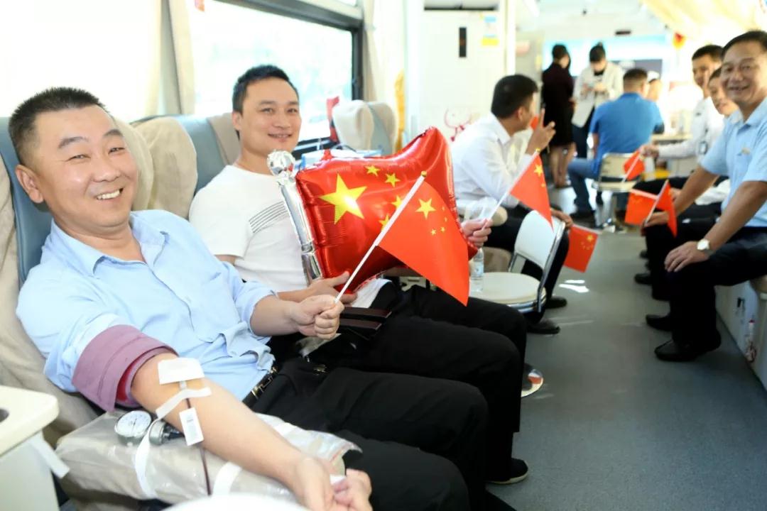 9月25日,闵行区的两家爱心单位员工带着国旗登上爱心献血车纷纷慷慨无偿献血,表白祖国!