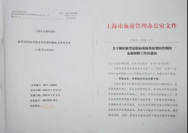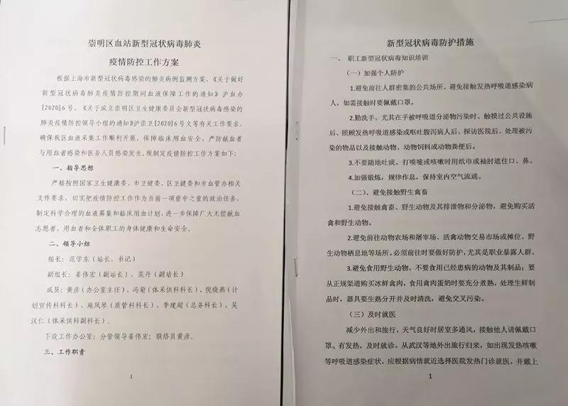 疫情发生后,崇明区血站迅速成立疫情防控领导小组,研究制定出台《崇明区血站新型冠状病毒肺炎疫情防控工作方案》《崇明区血站新型冠状病毒肺炎疫情期间献血者管理方案》,加强疫情期间献血场所和献血者的防控措施,做好清洁消毒、安全防护、医疗废物处置、健康教育等各项工作,同时加大献血点健康检查、健康征询力度。