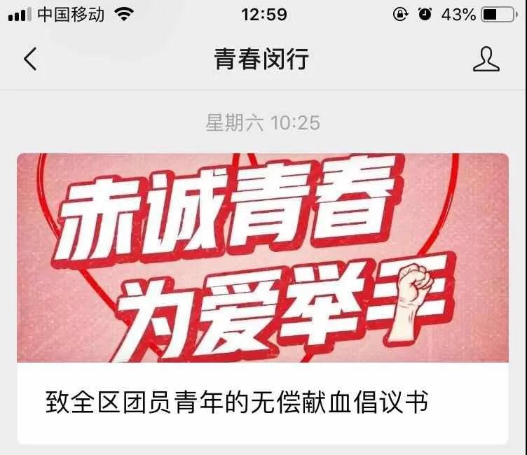 2月21日,闵行团区委在官方微信公众号号“青春闵行”向全区团员青年发出无偿献血倡议后瞬间得到了广大团员青年的积极响应。