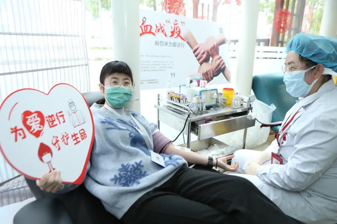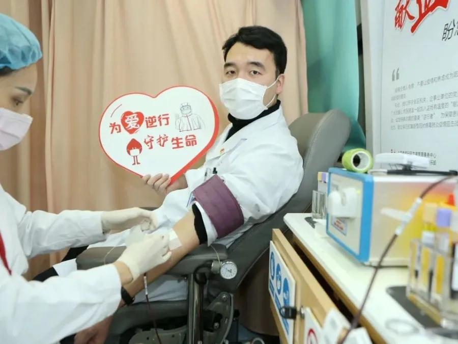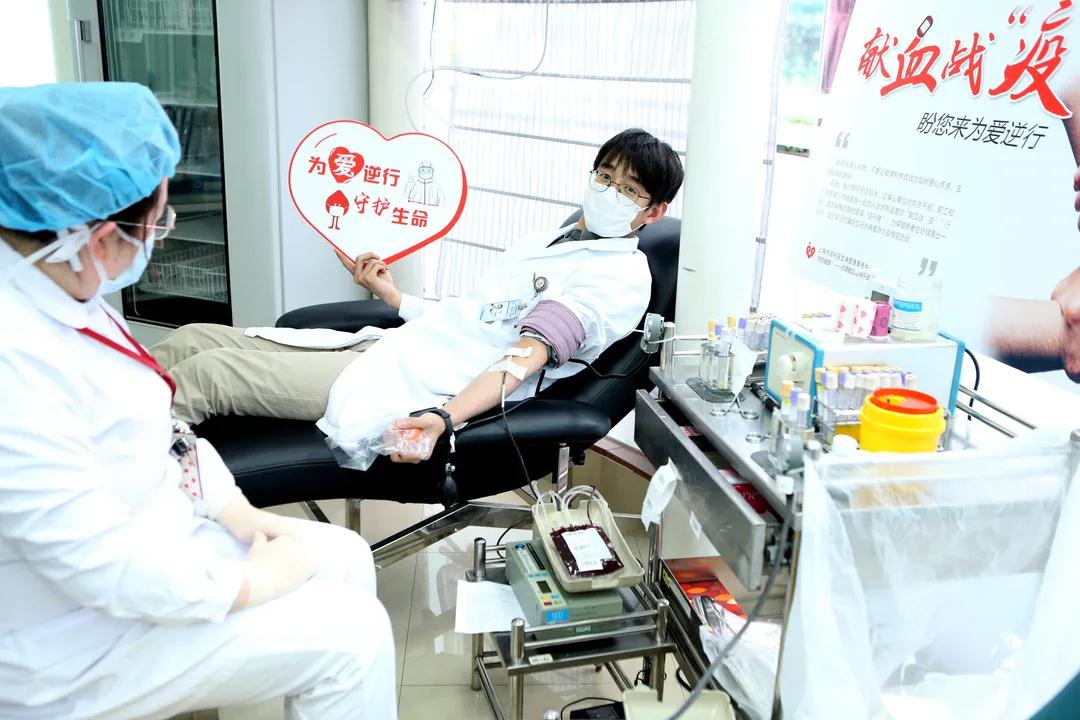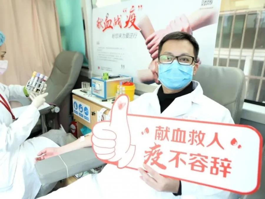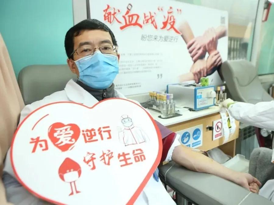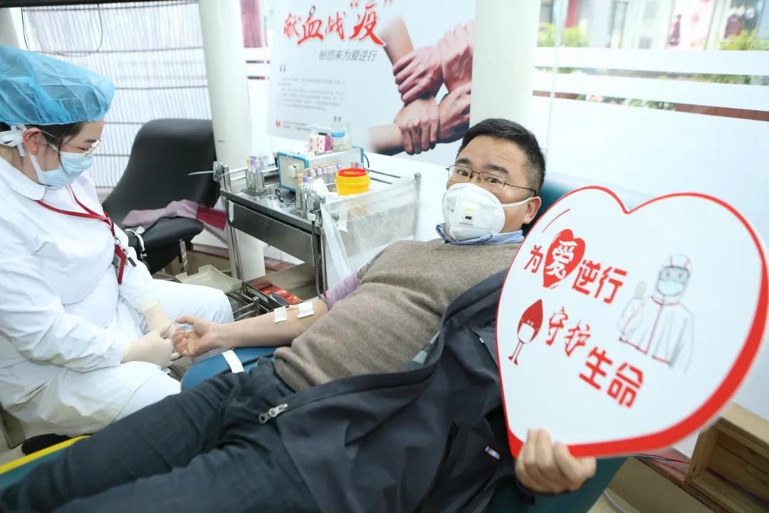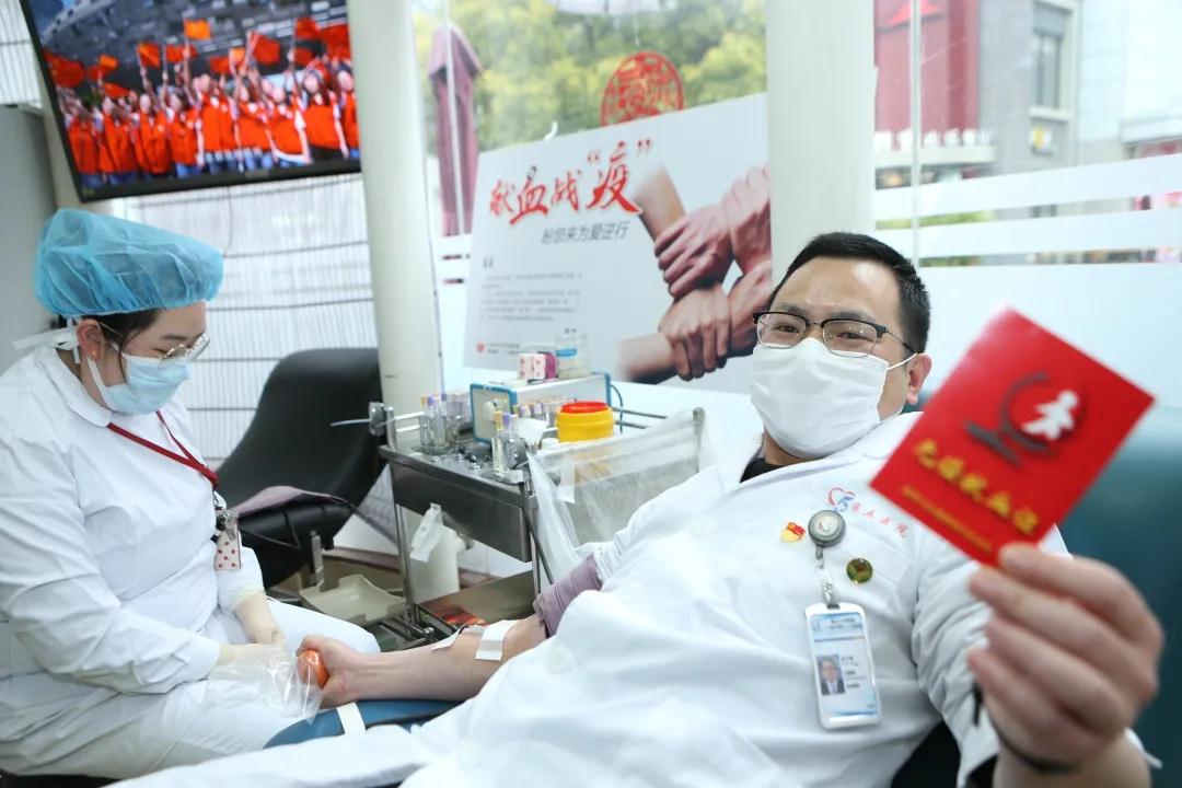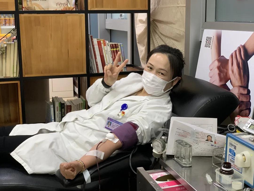 第4次无偿献血的汤书记献血时说:“得知血库告急,党支部在全院发出‘致全体党团员无偿献血倡议书’后,瞬间就有10余名党团员报名加入这场有温度的献血战‘疫’行动,共同为生命续航!”