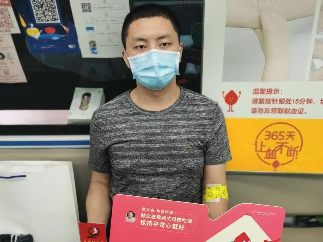 无偿献血者:沈太明,浙江省嘉兴市嘉善人,漕宝爱心献血点的固定无偿献血者。端午节当天从嘉兴西塘驱车2个半小时赶来献血,从2006年至今风雨无阻,已累计献血19次,共计7200ml全血。