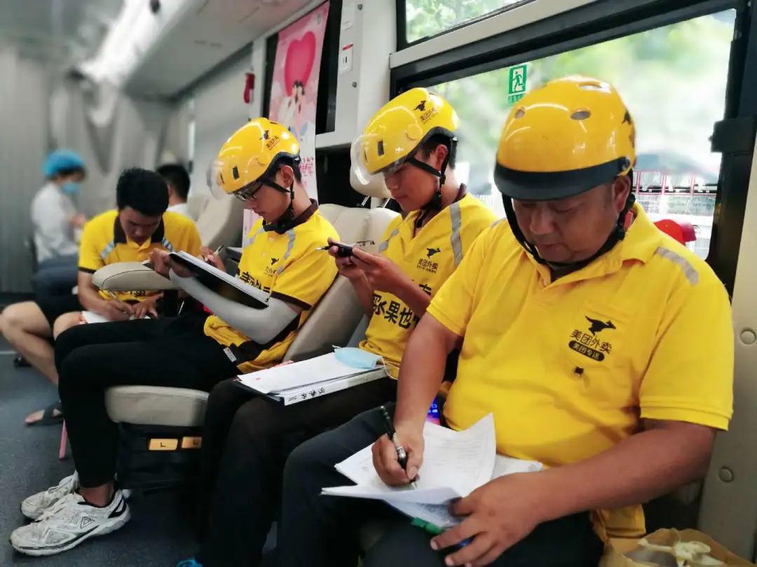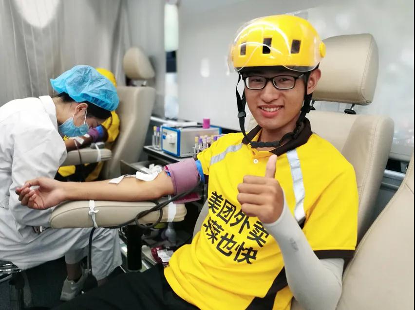 中午时分,爱心献血车迎来了首批无偿献血者,他们是6位美团外卖小哥。