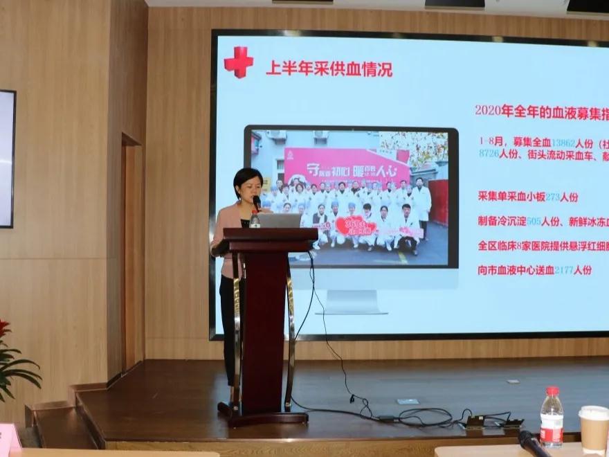 会上,嘉定区血站站长陆萍回顾了2020年1-8月的采供血情况,全面分析了今年全区的无偿献血及临床供血的形势;嘉定区血站副站长石益斌介绍了2020年上海市医疗机构临床用血工作考核要求。