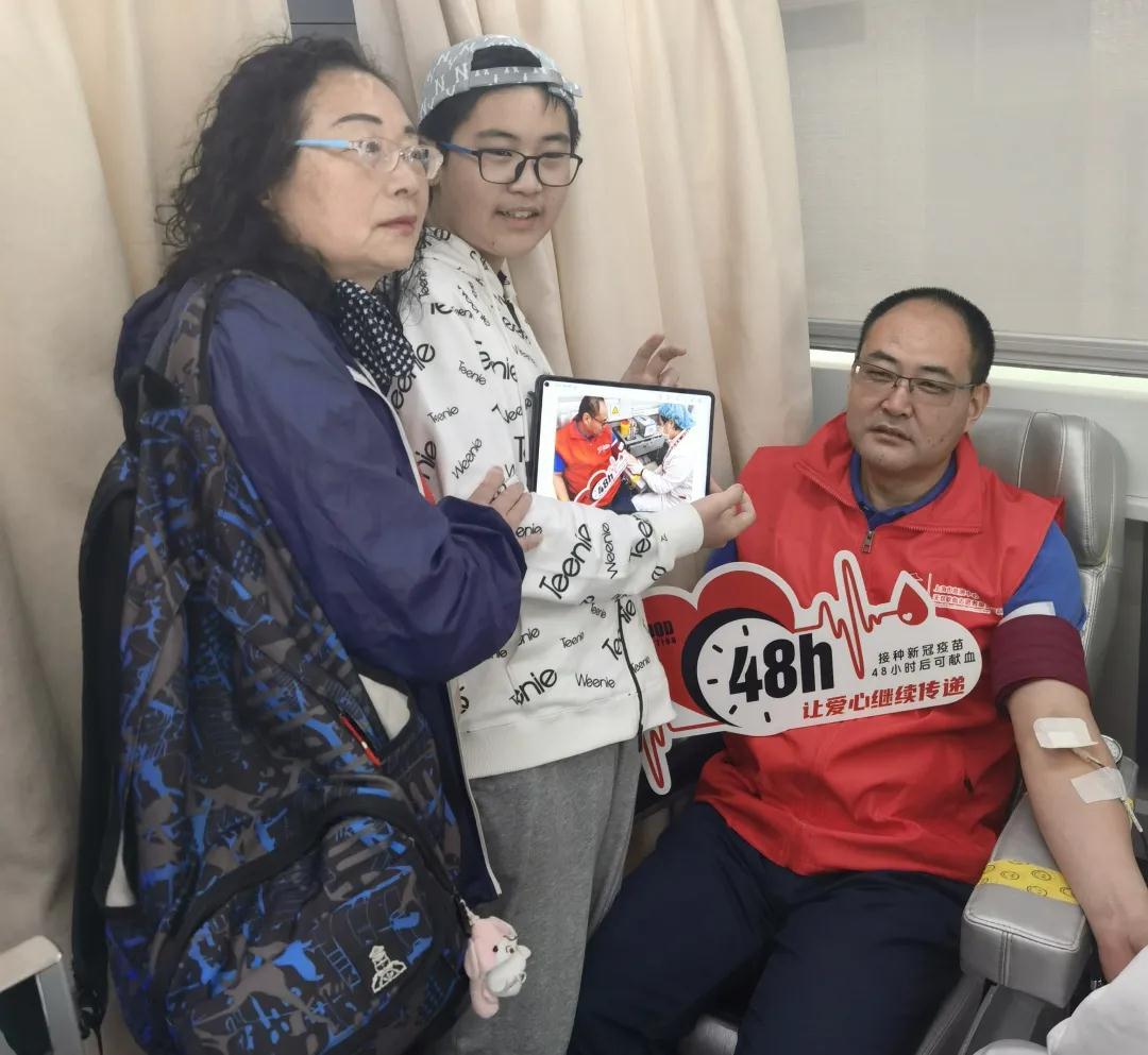一位年轻的妈妈和孩子路过爱心献血车时,孩子说,爸爸是一位经常无偿献血的志愿者,他鼓励妈妈也尝试一次无偿献血,并当场致电自己的爸爸,得到爸爸的鼓励后陪伴妈妈完成了她人生中的第一次无偿献血。