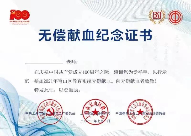 结合中国共产党成立100周年,宝山区教育系统为今年参加无偿献血的教工专门制作了无偿献血纪念证书。无偿献血教工表示在七一前夕参加无偿献血活动,作为对建党百年的献礼,极具纪念意义,纪念证书会好好珍藏。