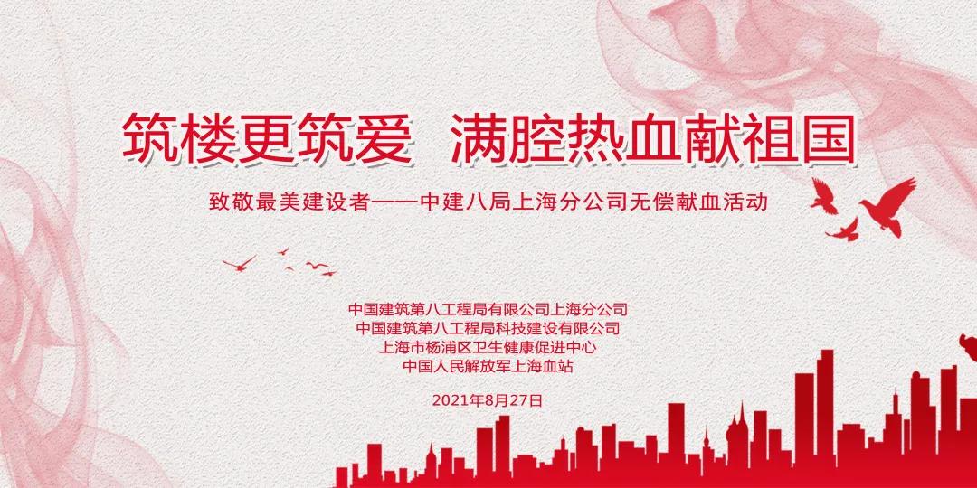8月27日,中国建筑第八工程局有限公司上海分公司、中建八局科技建设有限公司与杨浦区卫生健康促进中心(血管中心)、解放军血站联合开展“筑楼更筑爱,满腔热血献祖国”主题爱心无偿献血活动,200余位在职员工志愿献血,募集医疗用血52800余毫升。