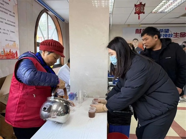 活动现场的另一抹亮色,是来自松江区卫健委退休党支部的老党员们,他们一边为无偿献血者送纪念品,一边送上一杯热水,时不时还寒暄几句,关心献血者的休息恢复情况。